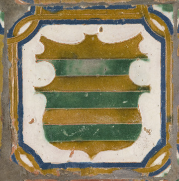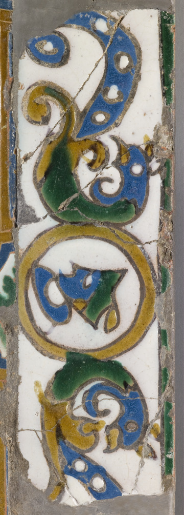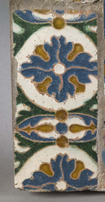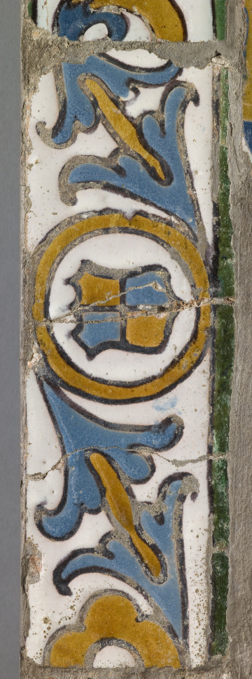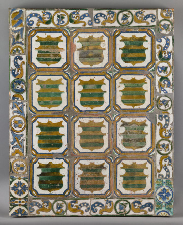 This tile panel is a composite made for sale in the United States, to hang on a wall like a painting. Its current form reflects a second life for these works of art, quite different from their original function as architectural revetments. The square tiles bear the coat of arms of a prominent Toledo family, the Riberas, and would have decorated the lower wall in one of their palaces or a building constructed under their patronage. The rectangular border tiles have generalized heraldic motifs that do not refer to a specific family. They are called alizares in Spanish and would have been used on staircases and as colorful accents on tiled floors. They are made using the cuerda seca technique, which means “dry cord.” This term refers to an oily substance composed primarily of manganese that was used to separate brightly colored glazes so that they would not run together during the firing process. This oily substance melts away, leaving a hollow in between the bright colors. Whereas glazing techniques came to Spain from Iran, the cuerda seca technique was a Spanish invention which later spread to Iran.