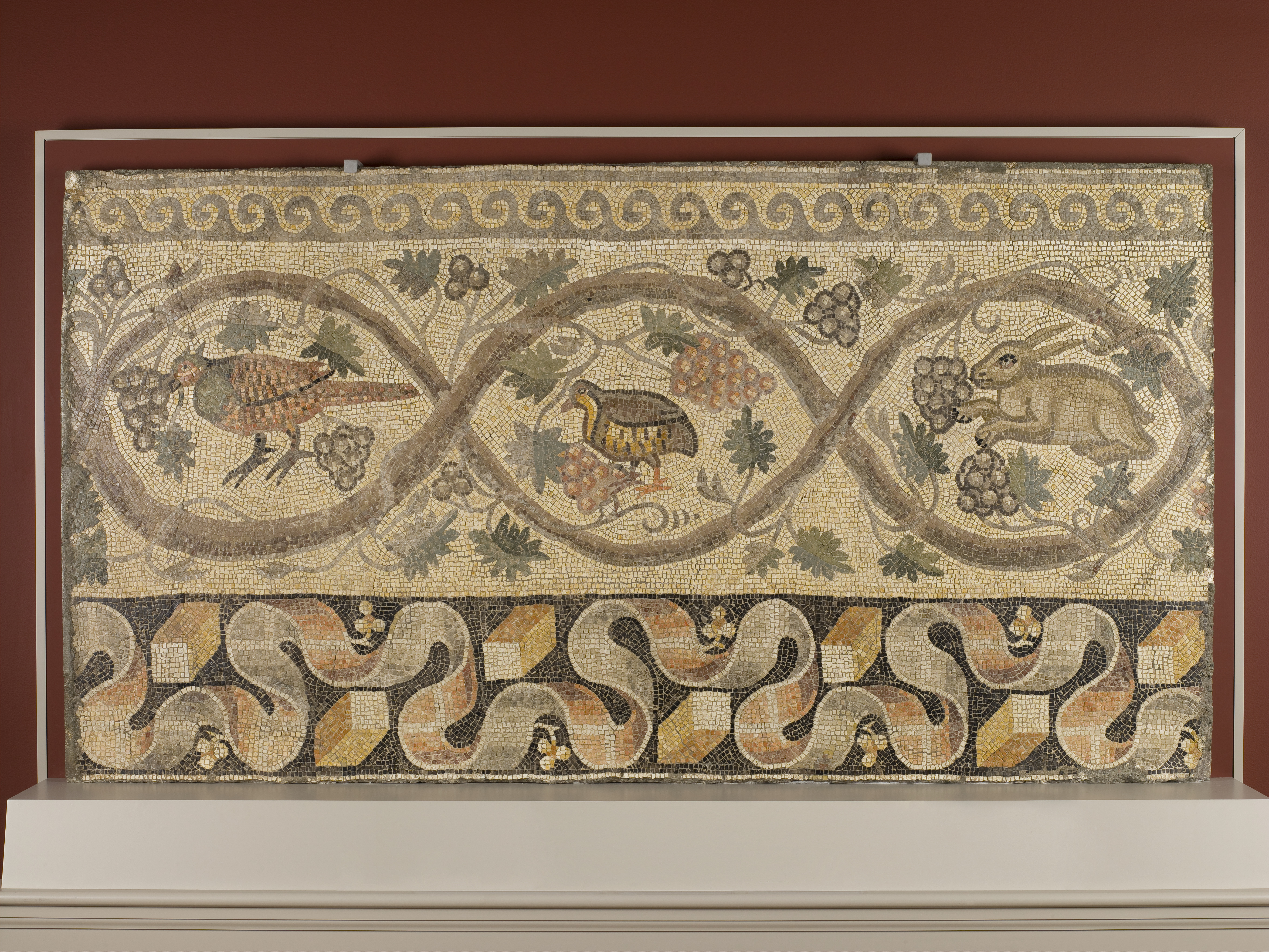 The undulating rinceau (vine) that forms the central part of this mosaic fragment was a popular border motif as far back as the Hellenistic period (331–31 BCE) when animals, grapes, and vines alluded to the god of wine, Dionysus (Greek) or Bacchus (Roman). In the Christian context of 6th-century Syria, the vine scroll acquired a new meaning, calling to mind the words of the evangelist John 15: 1-5: “I am the true vine...You are the branches. He who abides in me bears much fruit.”