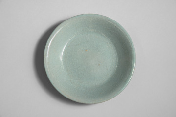 This simple but extraordinary dish is one of the great mysteries of Chinese pottery known as imperial Ru ware. The intrigue surrounding the ware begins with its extreme rarity; this dish is one of a very small number of Ru in the West. The mystique of Ru is further enhanced by its remarkably subtle celadon glaze, a unique color that is soft blue-green with a underlying blush of rosy pink. The finely crackled glaze appears as if slivers and flakes of ice were frozen in the celadon. This tantalizing play of color is appealing, especially when the glaze covers such a refined and elegant shape. The secrets of the Ru kiln were lost for eight hundred years until the site was discovered and excavated late in the twentieth century.