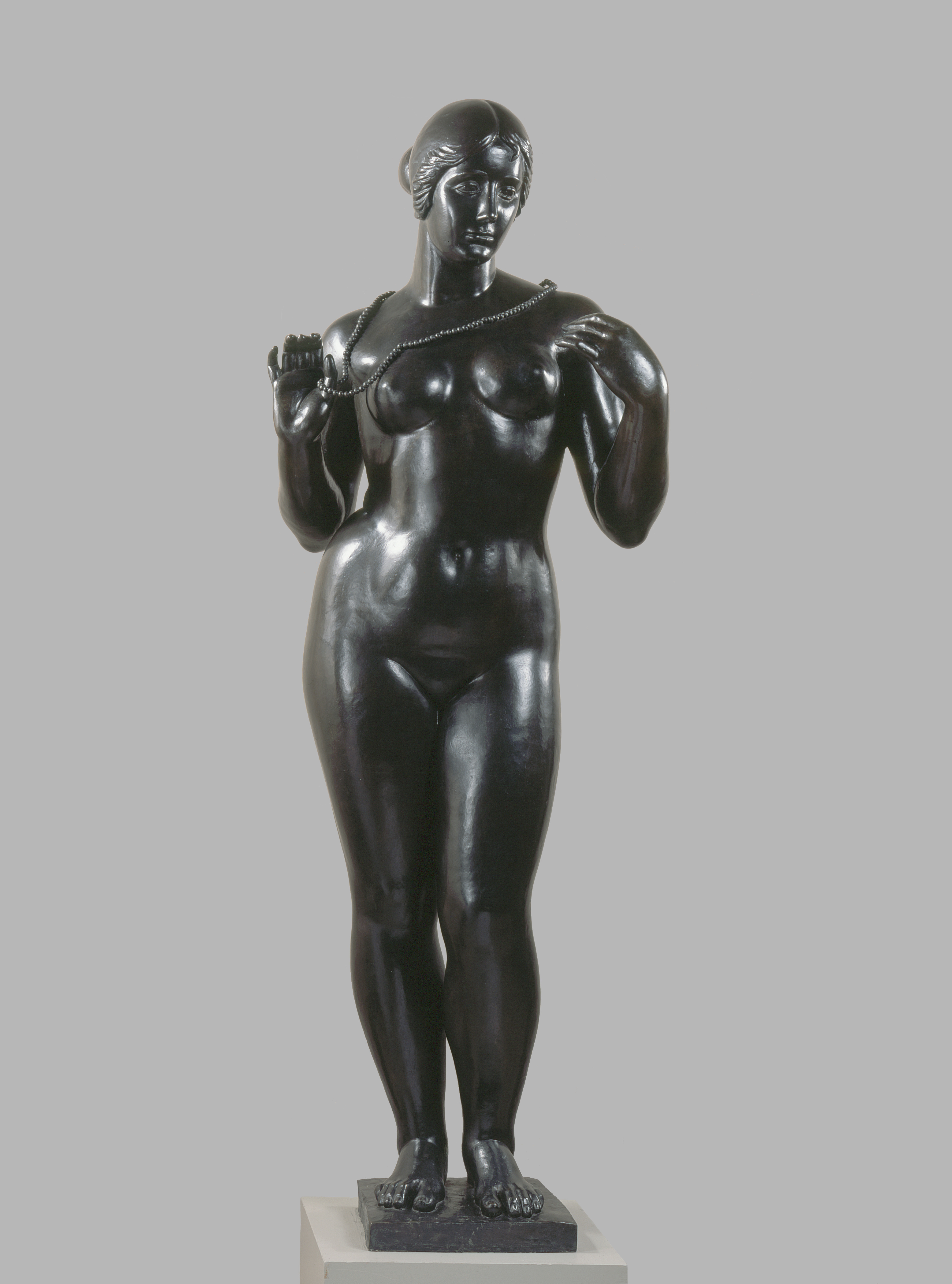 This monumental, yet graceful figure approaches the realm of abstraction: the  surface of her body is comprised of smooth, rounded volumes and personal expression is absent from her face. Maillol aspired toward simplicity and perfection in his sculptures, which led him to return to the same subjects over and over again. It took him fifteen years to complete his modern rendition of the ancient Roman goddess Venus, and he executed two versions of her, both with and without a necklace.