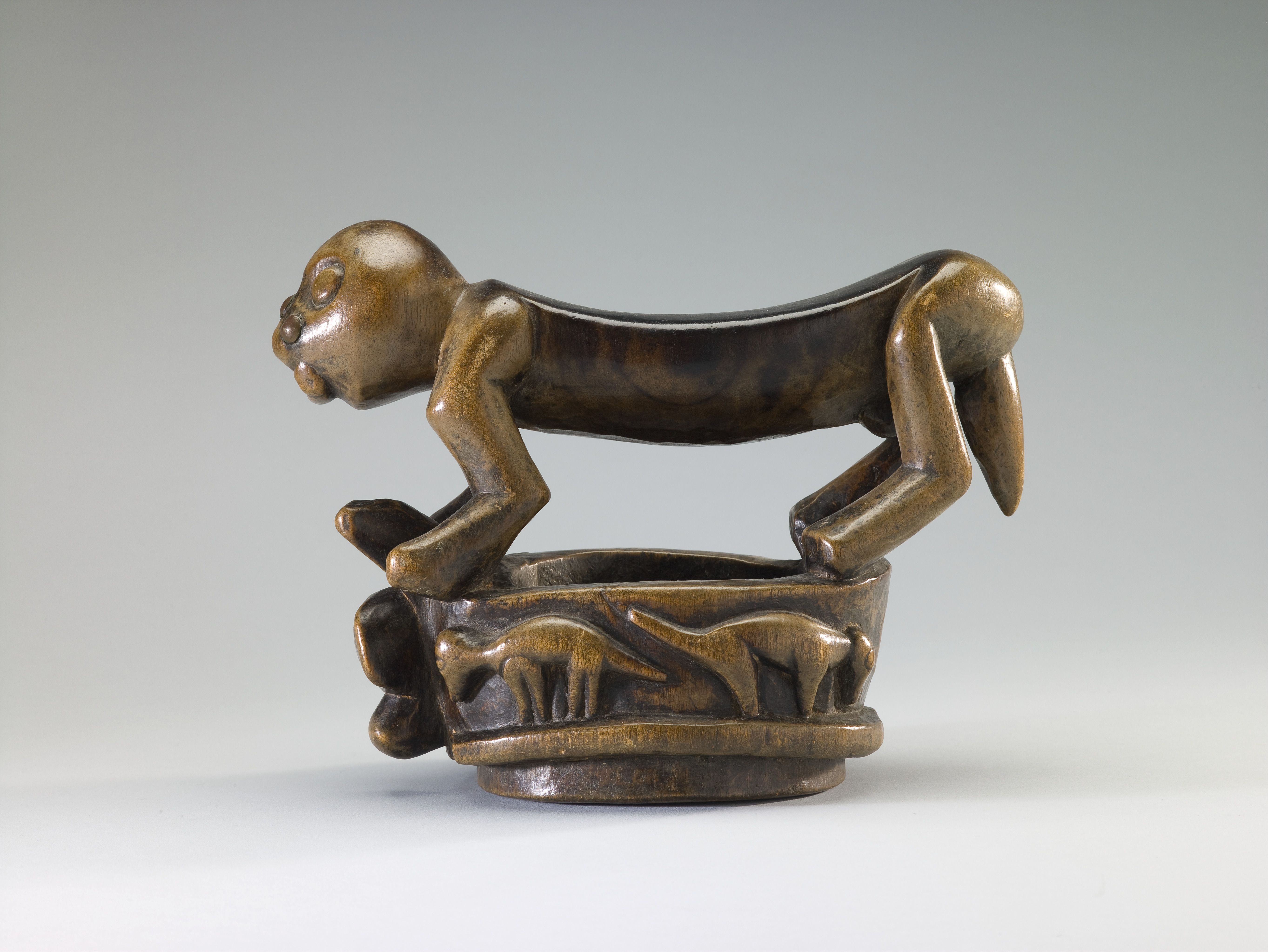 [2] An invoice dated March 27, 1942 from Primitive Arts to the City Art Museum documents the purchase of this object, listed as "one African (Bayak culture, Belgain Congo) head-rest with a figure of a mountain lion on a circular base decorated with totemic animals" [SLAM document files]. Minutes of the Administrative Board of Control of the City Art Museum, April 2, 1942.