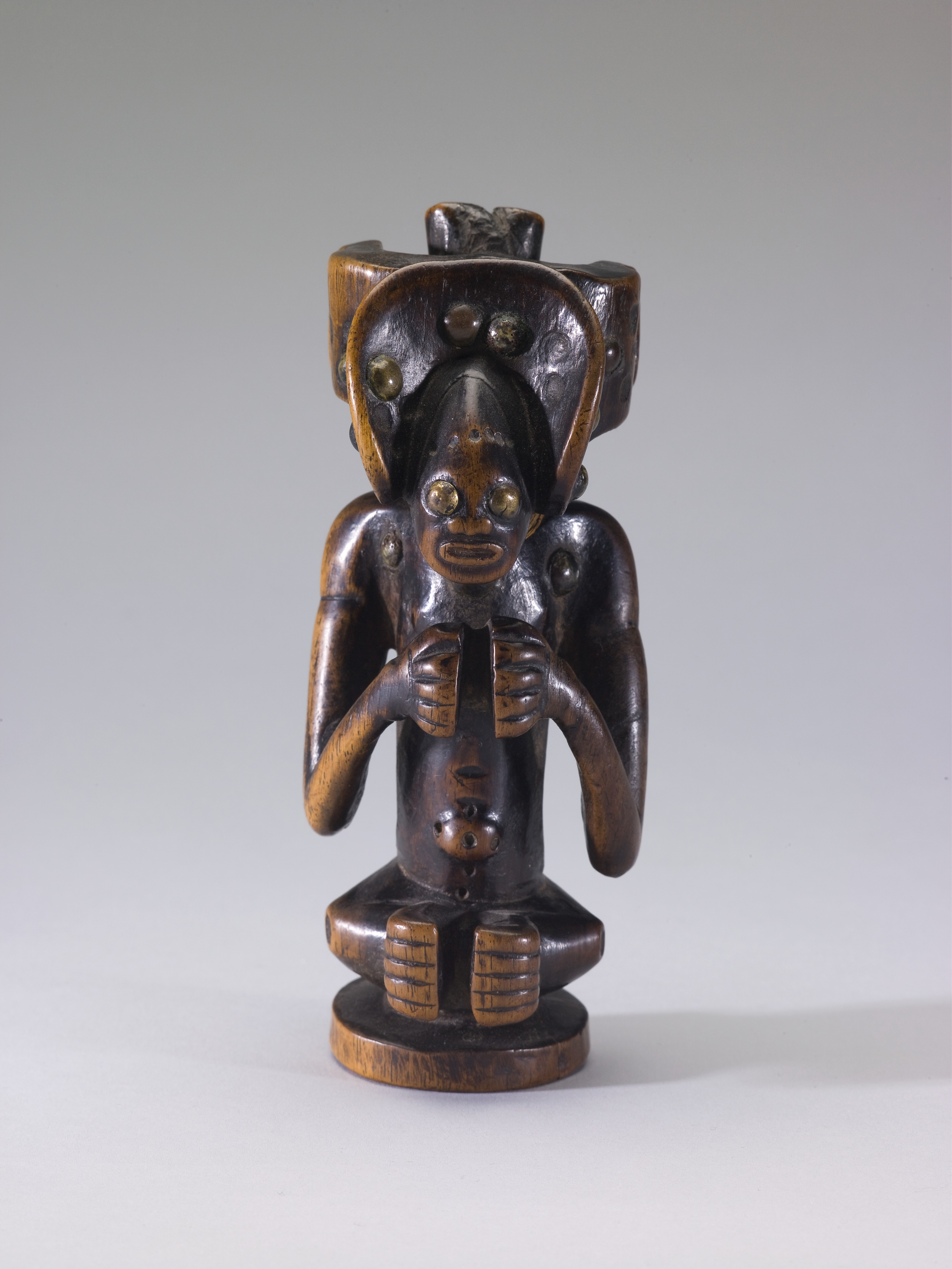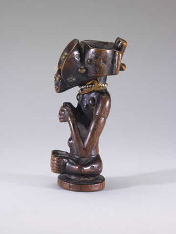 Imaginative smoking paraphernalia offered visual and tactile pleasure while preparing and smoking tobacco. The figure portrayed here may represent the pipe’s owner. The elaborate crown and hairstyle, called "cikunga," is the emblem of a Chokwe chief. The brass upholstery tacks accentuating the figure’s head and body further enhanced the prestige of the pipe as these were foreign, imported materials.