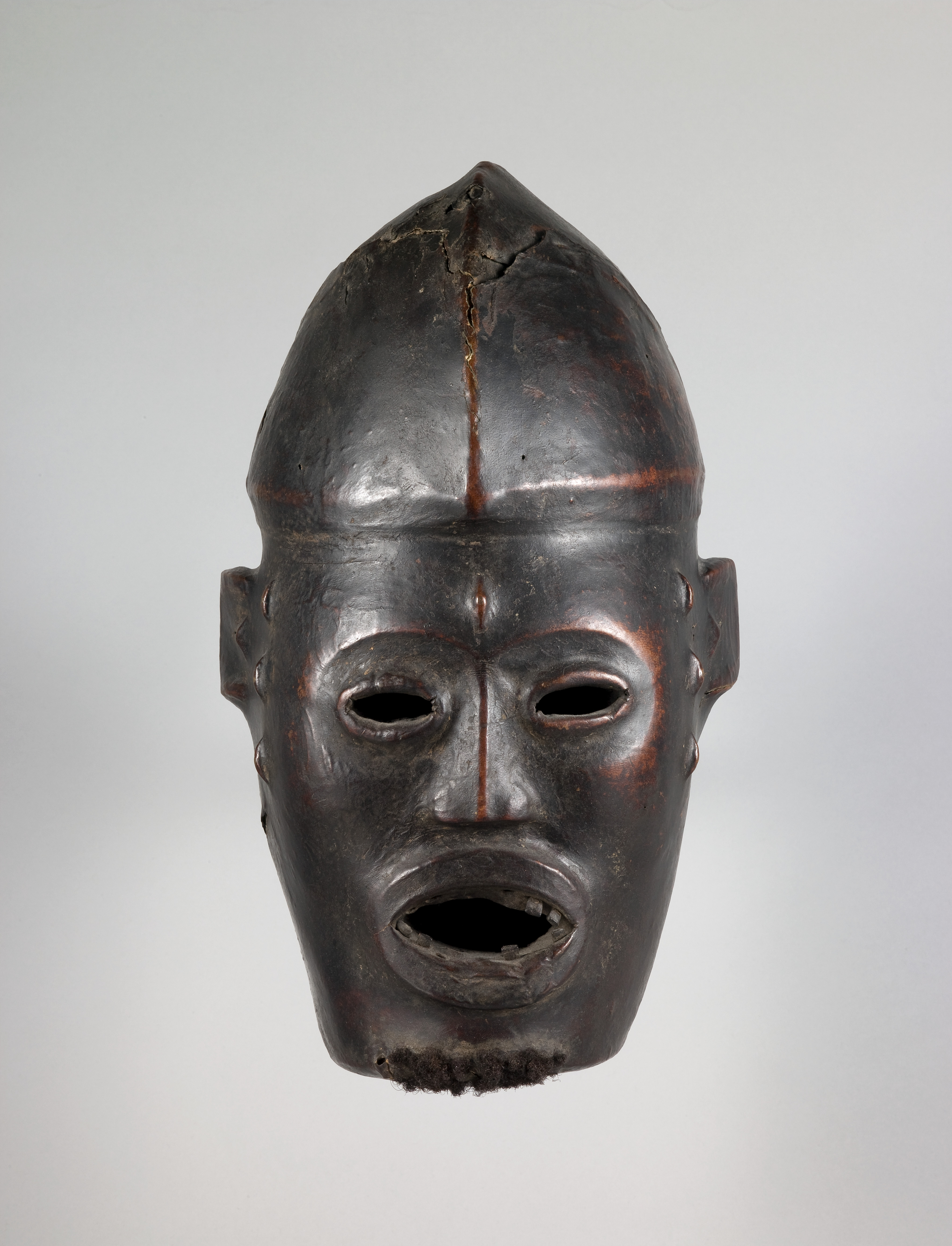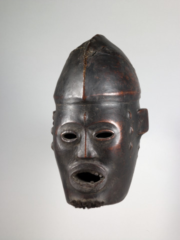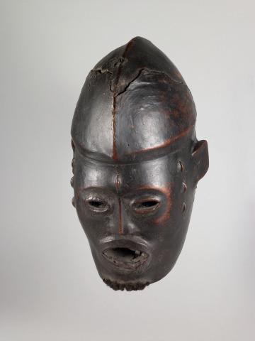The fierce appearance of this mask is suitable for its intended association with the Nchibe society of hunters and warriors. Despite an attitude of aggression, the mask displays delicate sculptural modeling and is one of the finest examples of its type. The animal hide stretched and dried over the carved wood makes the mask almost lifelike, highlighting the cheekbones, brow, and raised facial scarifications. Prior to performance, the skin of this mask was rubbed with oil, causing the surface to glisten, while the eyes were highlighted with white clay. Masks such as this typically appeared in the context of funerals for important men.
