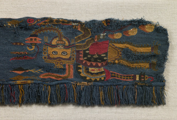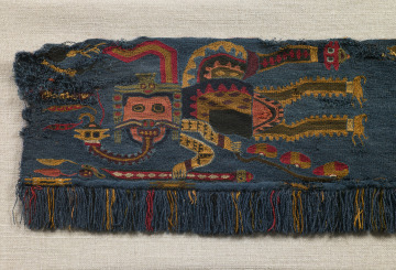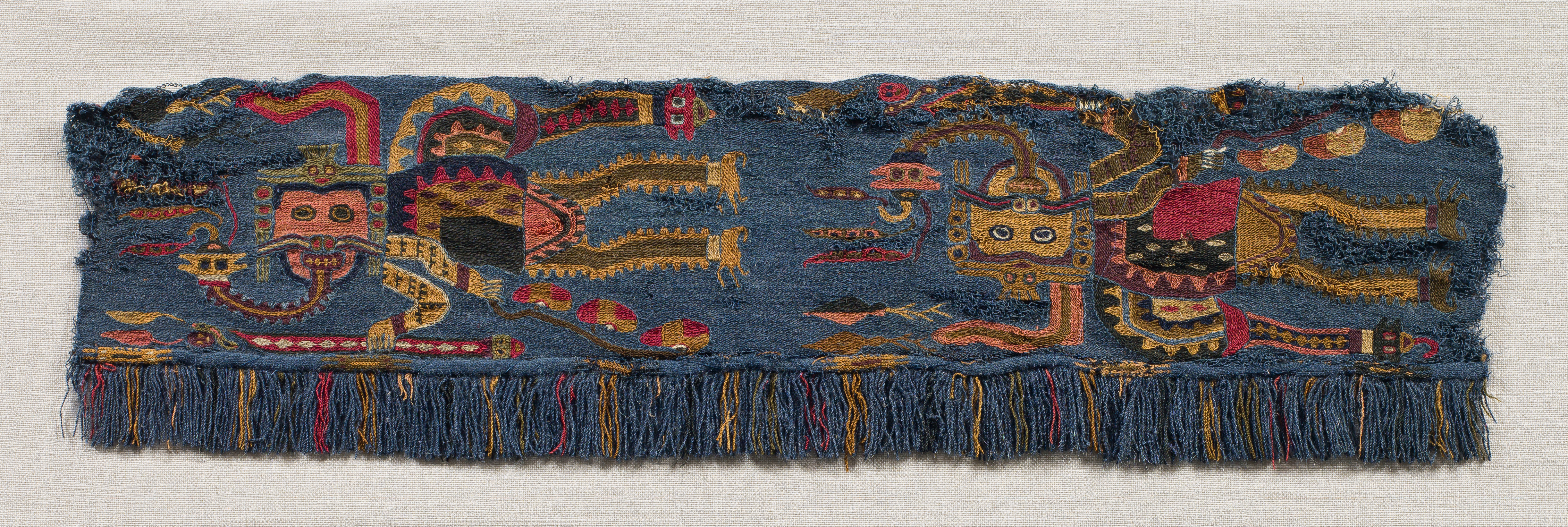 Peruvian textiles frequently contain repeated imagery with alternating colors and inversions. These carefully devised patterns were highly symbolic, representing the organization of varied designs into a harmonious whole. The imagery on this textile could also evoke relationships between forms, particularly those in the natural world. On the Paracas fragment, composite beings celebrate the importance of the agricultural cycle. Both figures carry strings of lima beans in one hand while chili peppers emanate from a staff in the other and tubers float above their heads. These fancifully dressed beings oversaw the crops of carefully tended Paracas farms.