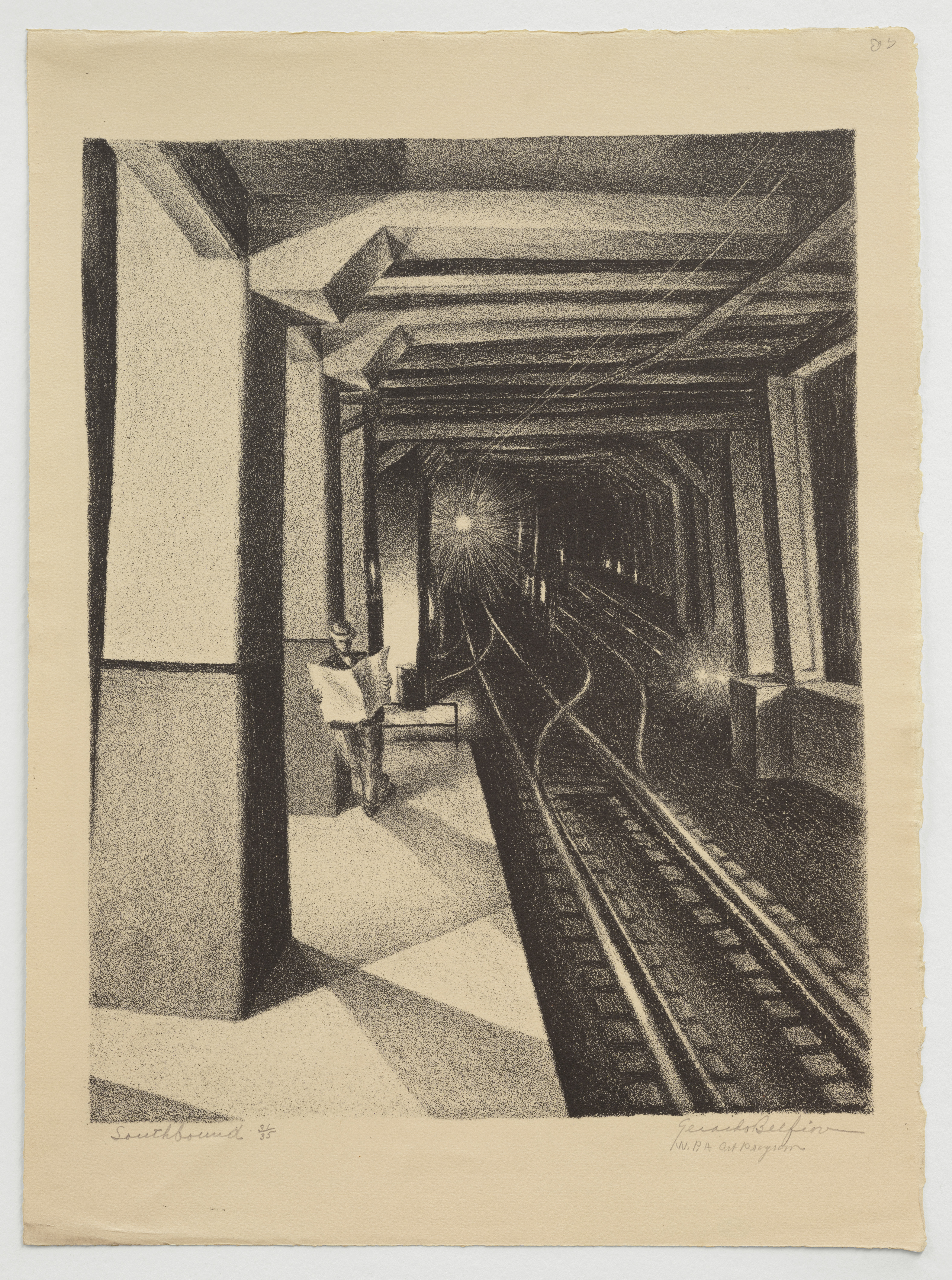 Standing on a platform of the Broad Street subway, a lone figure awaits the bright light of a rapidly approaching train. Work Projects Administration funds enabled the construction of a southward extension of the line to Snyder Avenue, which opened in 1938. The composition captures the daily routines of moving around the city, an experience Gerardo Belfiore chose to represent in a work produced in a Federal Art Project workshop. In both image and making, the print is a testament to the many ways that government funds supported infrastructure and culture.
