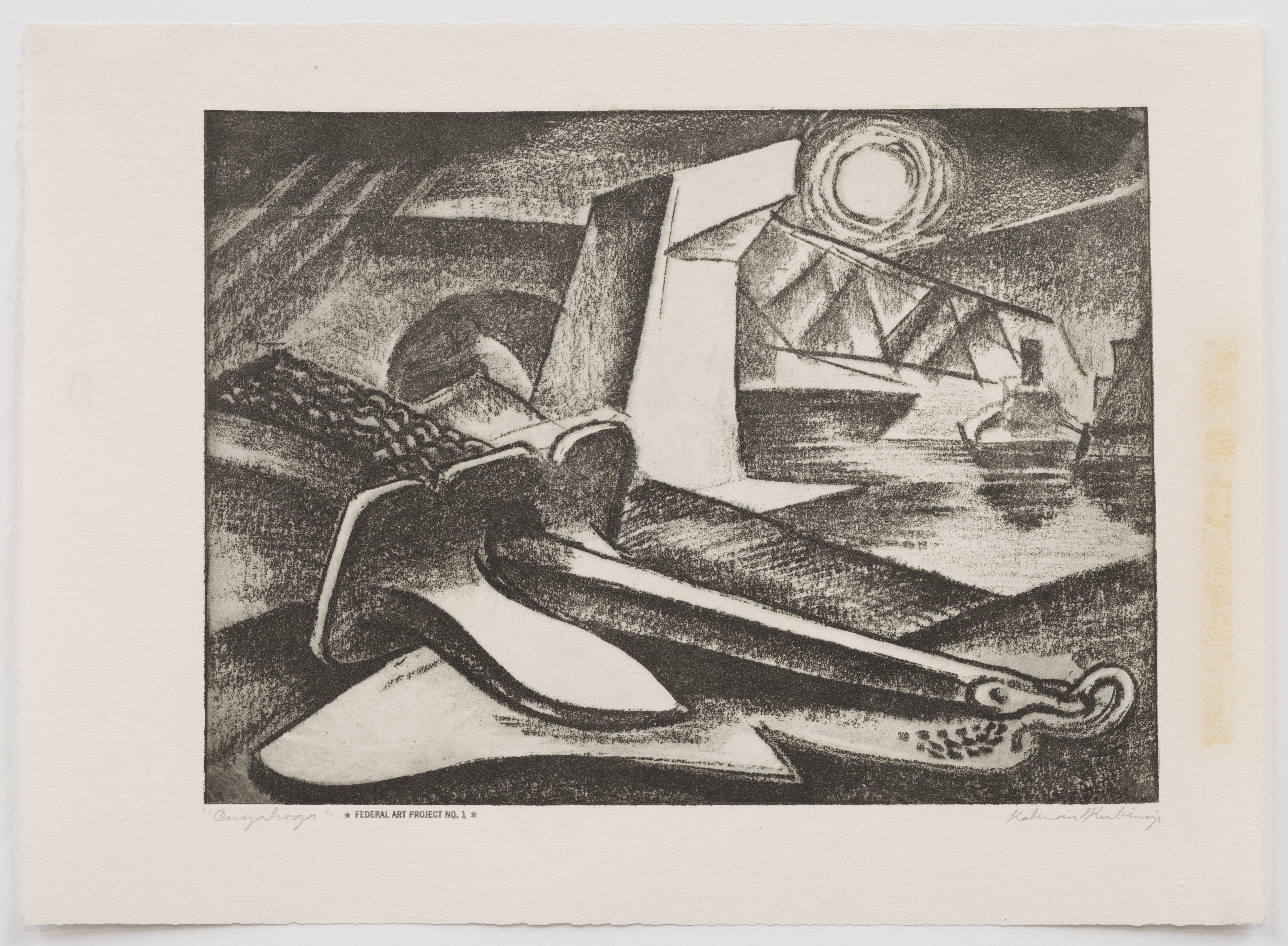 The industrial strain on Cleveland’s Cuyahoga River appears in this jumble of machinery and almost too-brilliant sun. From 1935, Kálmán Kubinyi, the son of Hungarian immigrants, worked as the supervisor of the Federal Art Project print project in Cleveland, contributing to its particularly innovative spirit. In developing the technique termed “offset soft ground,” he created a way for artists to transfer a drawing directly onto the etching plate. The soft ground picked up every shift in pressure and texture of the crayon such that it appeared in the final image.