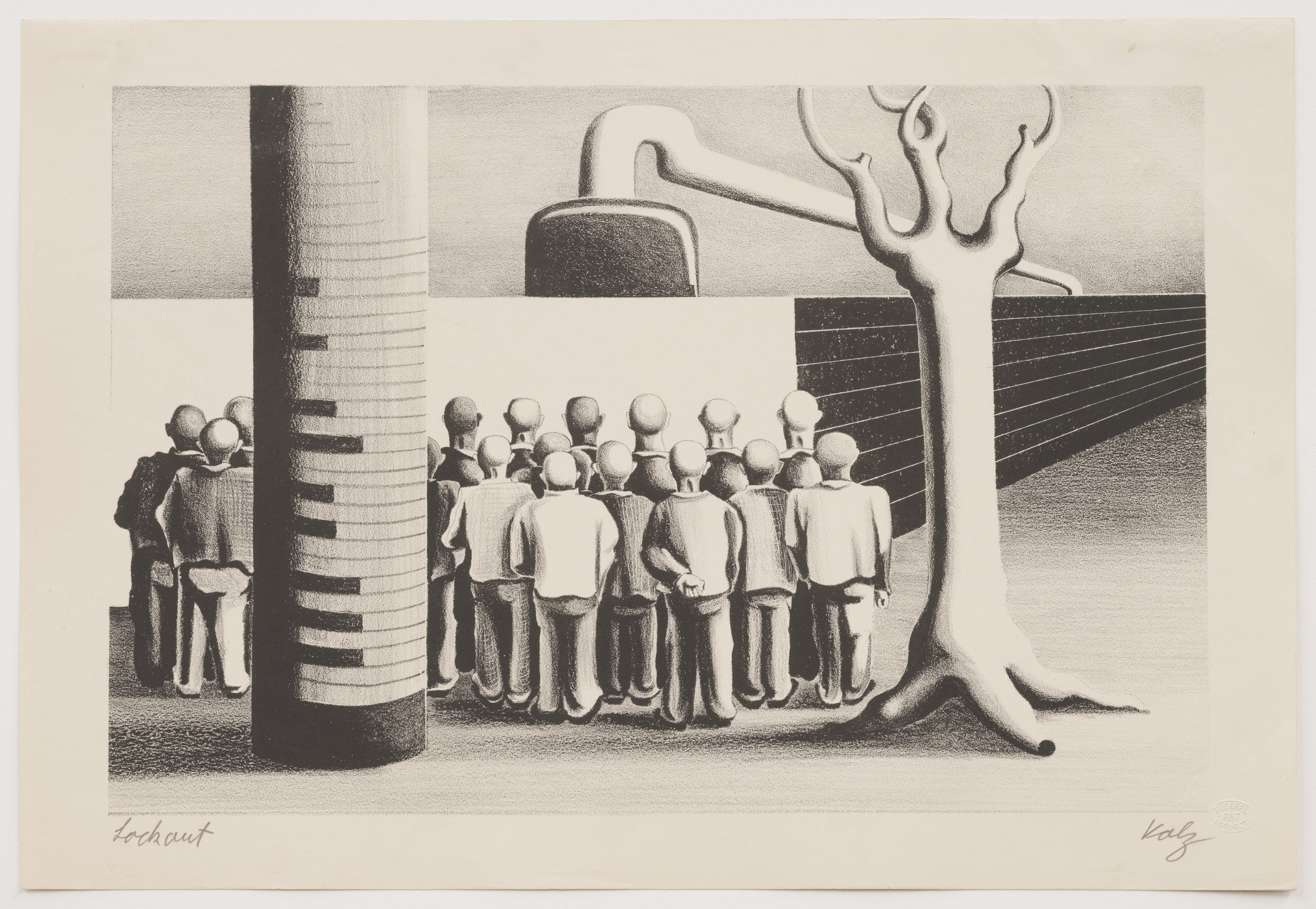 Amid rows of neatly arrayed faceless heads and ears, the small detail of two clenched fists suggests the force present in this assembly. A tree’s natural form contrasts with the industrial operations beyond the wall, out of view and inaccessible to the workers. The title of this lithograph refers to a tactic frequently used by management during strikes and labor disputes in the 1930s. Herman Volz himself actively organized artists to consider their own work as labor through the San Francisco Artists Union.
