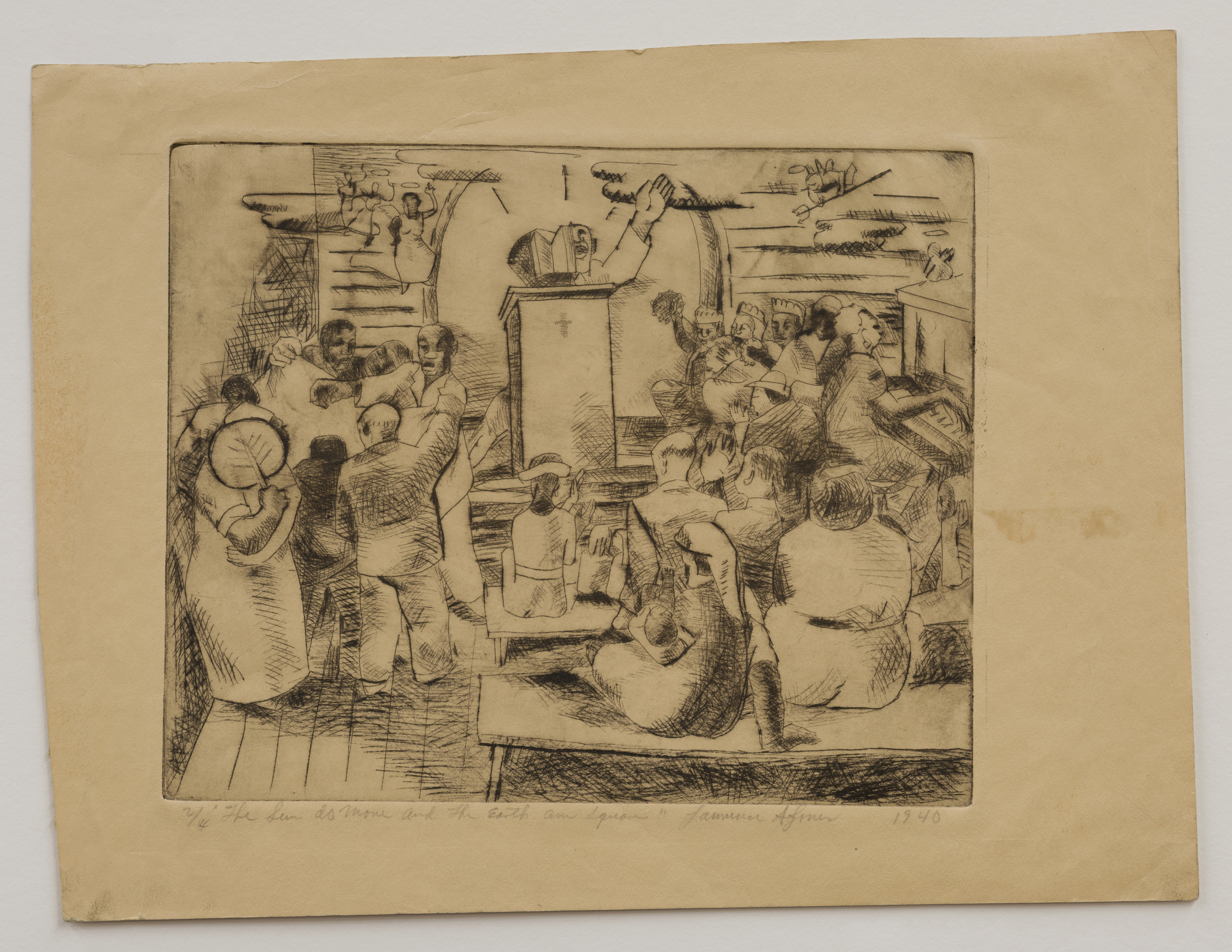 A stirring sermon fills a small Baptist church. Supernatural figures also attend, including dancing angels and a flying devil. The print’s title derives from a famous 19th-century sermon on God’s power. Lawrence Arthur Jones grew up attending a similar church, where he sang in the choir his father directed. Jones studied at the Art Institute of Chicago before moving to New Orleans in 1938 to teach at Dillard University, Louisiana’s first historically Black university. The Federal Art Project in New Orleans got off to a shaky start in 1935 due to its first director’s prejudices. Under new leadership in 1938, more African American artists joined its ranks, including Jones.