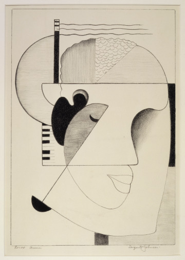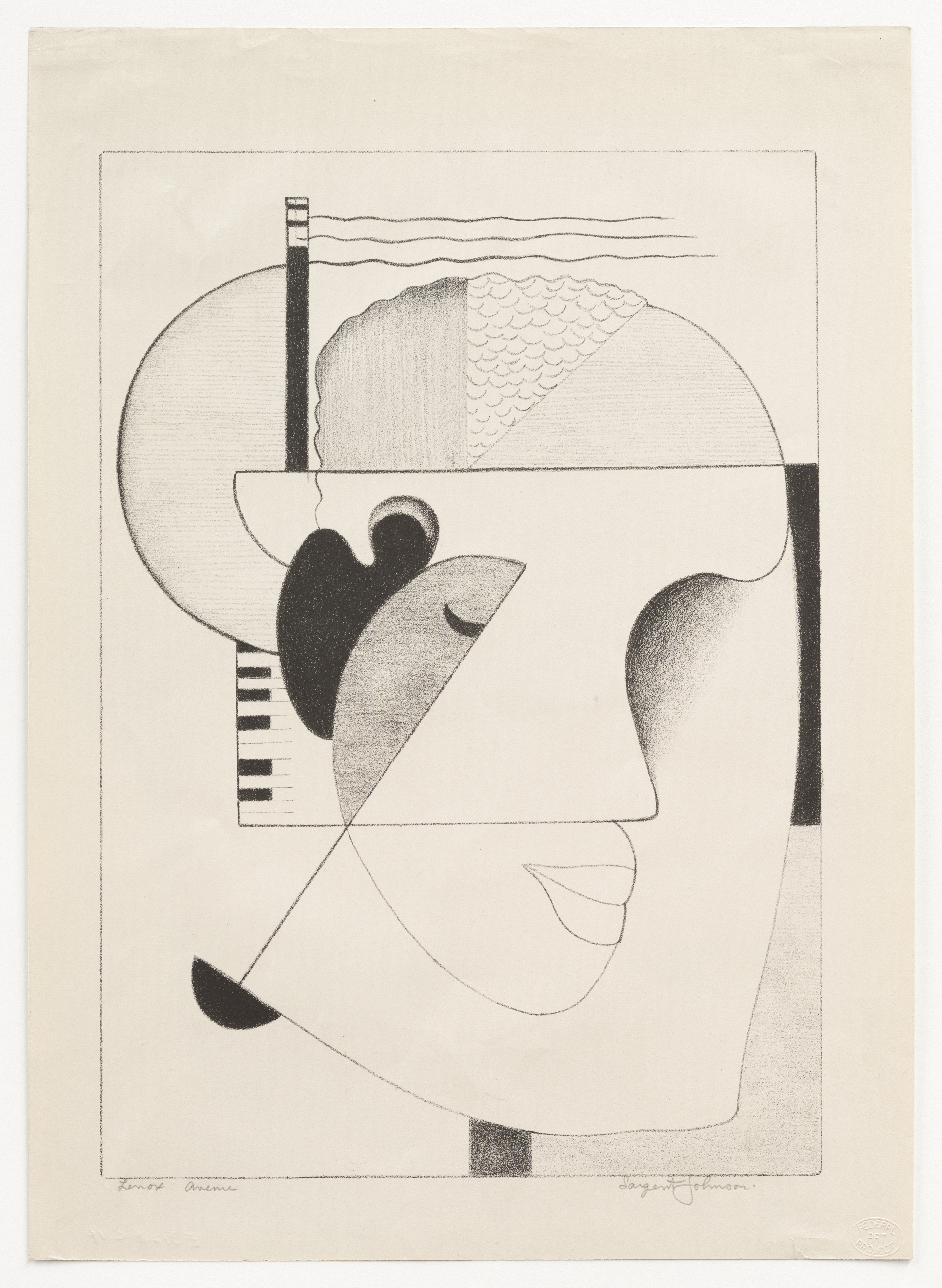 Music flows through this print, with the figure’s prominent ear and closed eye overlaid with the shape of the piano and keys. Titled Lenox Avenue, in reference to the street in Harlem, New York, it captures the nationwide influence of that center of Black music and culture. Sargent Johnson primarily worked as a sculptor, creating large-scale installations for the Work Projects Administration. Johnson drew on motifs from African sculpture in an effort to bridge a history of artistic practice with his own experience as an African American artist. His approach is visible here as he plays with forms to communicate a sense of sculptural relief in only two dimensions.