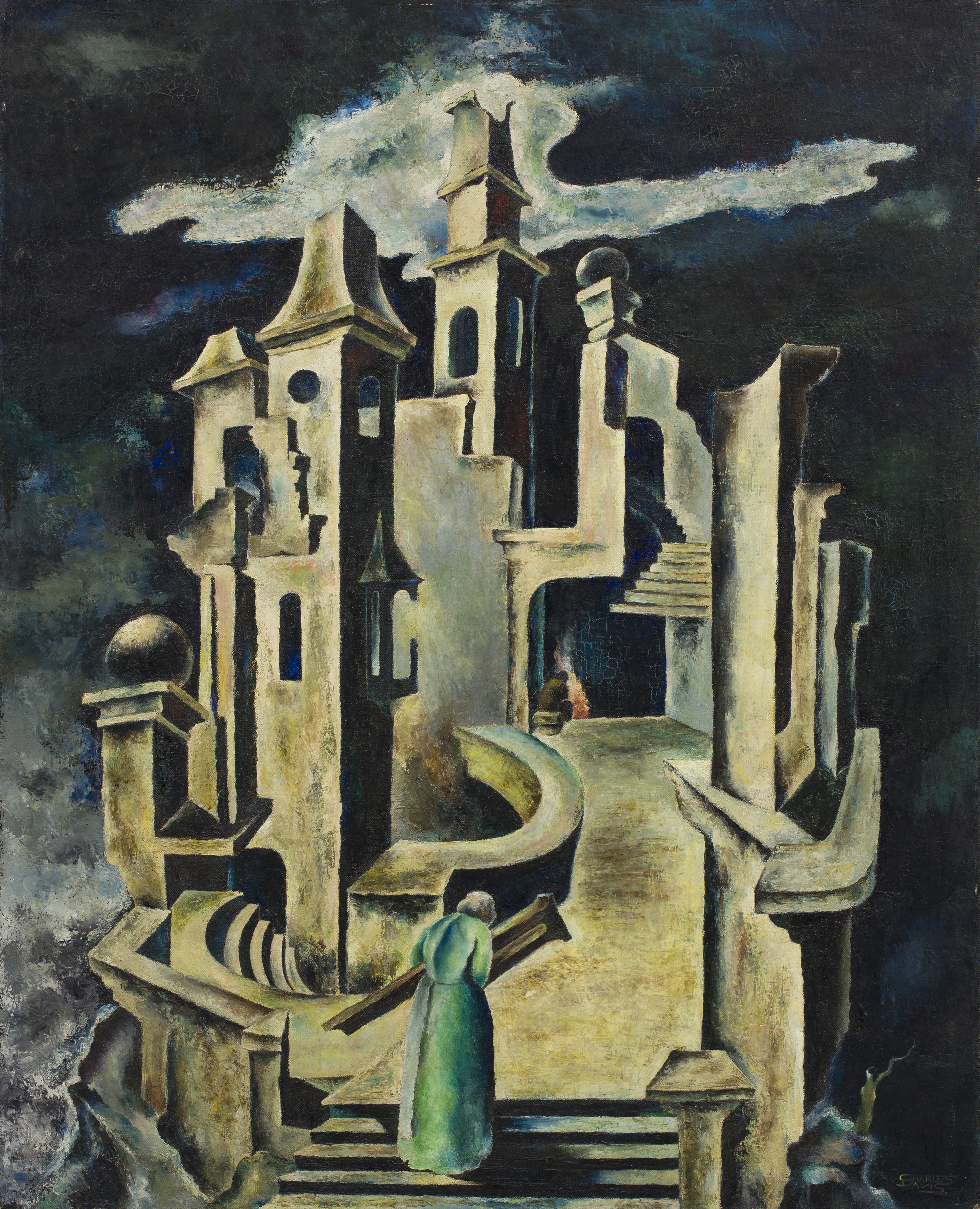 Mists swirl around the turrets of an imaginary construction. Nocturne to Victoria demonstrates the freedom that Federal Art Project support gave artists to experiment with technique. Charles Davis layered paint with glazes of oil and varnish to give a craggy texture to the crumbling structure. In music and poetry, nocturnes are pensive compositions, evocative of the ending of one day and the transition to the next. The painting’s title invites viewers to consider the decay of the old world and the struggle to build a new one.