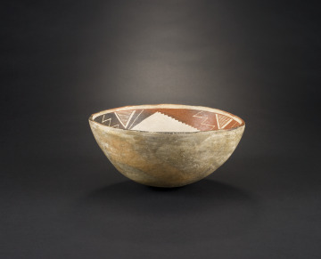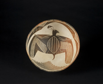The Mimbres developed a highly refined tradition of pottery that is characterized by beautifully painted narrative scenes. The central, concave area of this bowl's interior depicts an animal with the outstretched wings of a bat and the ears of a rabbit.