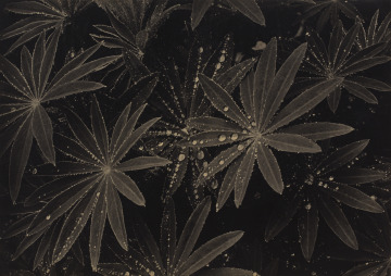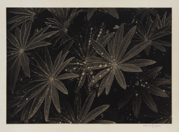 In 1940, at about the same time it started to collect photographs, the Saint Louis Art Museum began to host an annual competition called the Saint Louis International Salon of Photography. Laura Gilpin was one of its most distinguished contributors, and her photograph entered the Museum's collection as a result of the event. Gilpin's warm-toned black and white photograph captures young lupin plants before they erect the showy spikes of flowers that are their most obvious feature. Their tender leaves, sprinkled with raindrops, form a sunburst-like pattern across the image. The immature plants speak of rebirth, growth, and potential, while the water droplets on their leaves suggest purification.