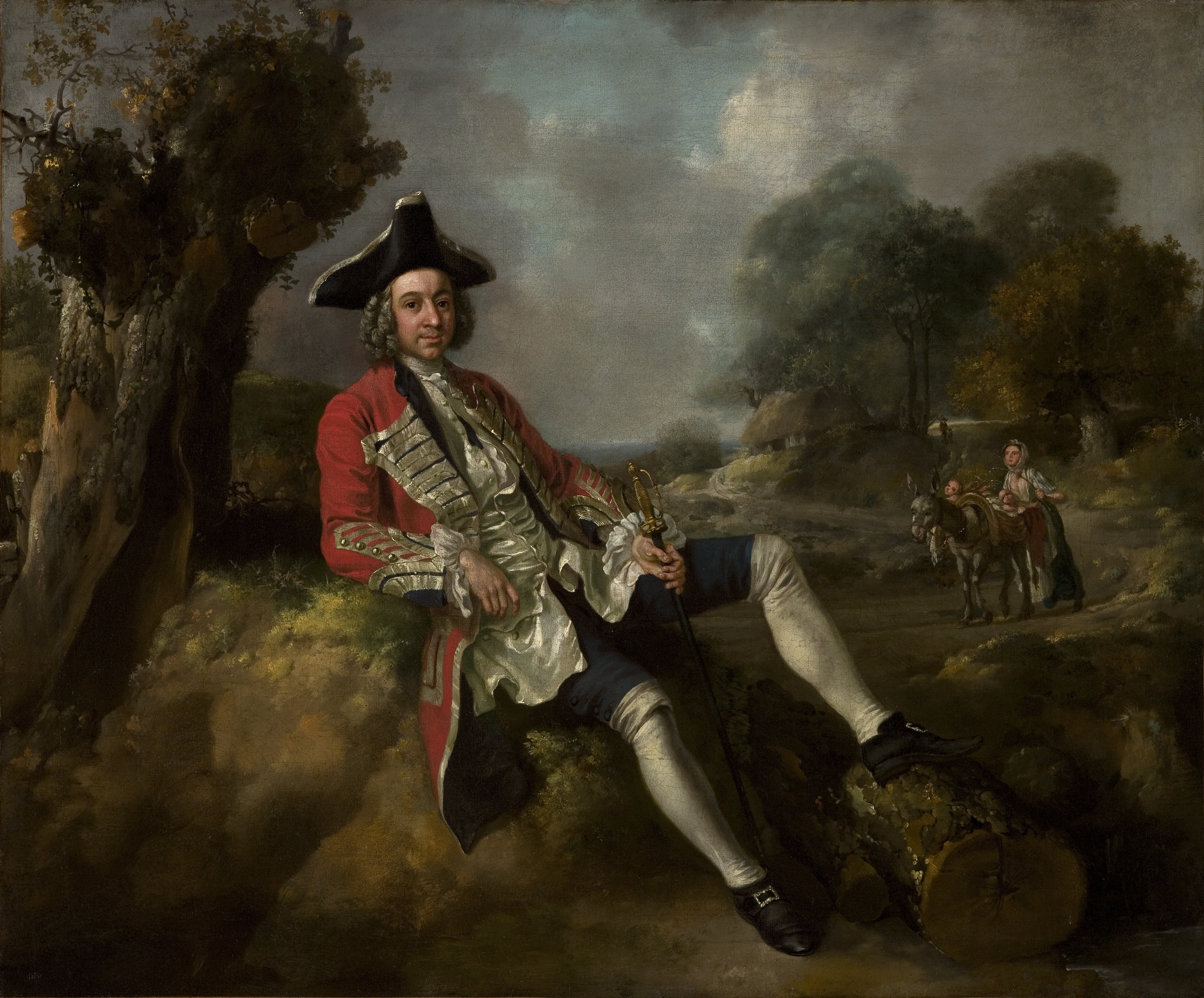 Painters often collaborate, and this painting seems to have been made by two different artists. Thomas Gainsborough was a pupil of Francis Hayman, although it is not known how often they worked together. The subtle lighting and lighter touch that Gainsborough used in the landscape differ from the more deliberate way Hayman depicted light falling on the foreground figure. Although the man’s identity is not known, he probably was among the landed gentry, one of the upper class who made the Grand Tour to Italy to study art and antiquity. The gentleman relaxes, in sharp contrast to the woman laboring to drive the donkey cart behind him.