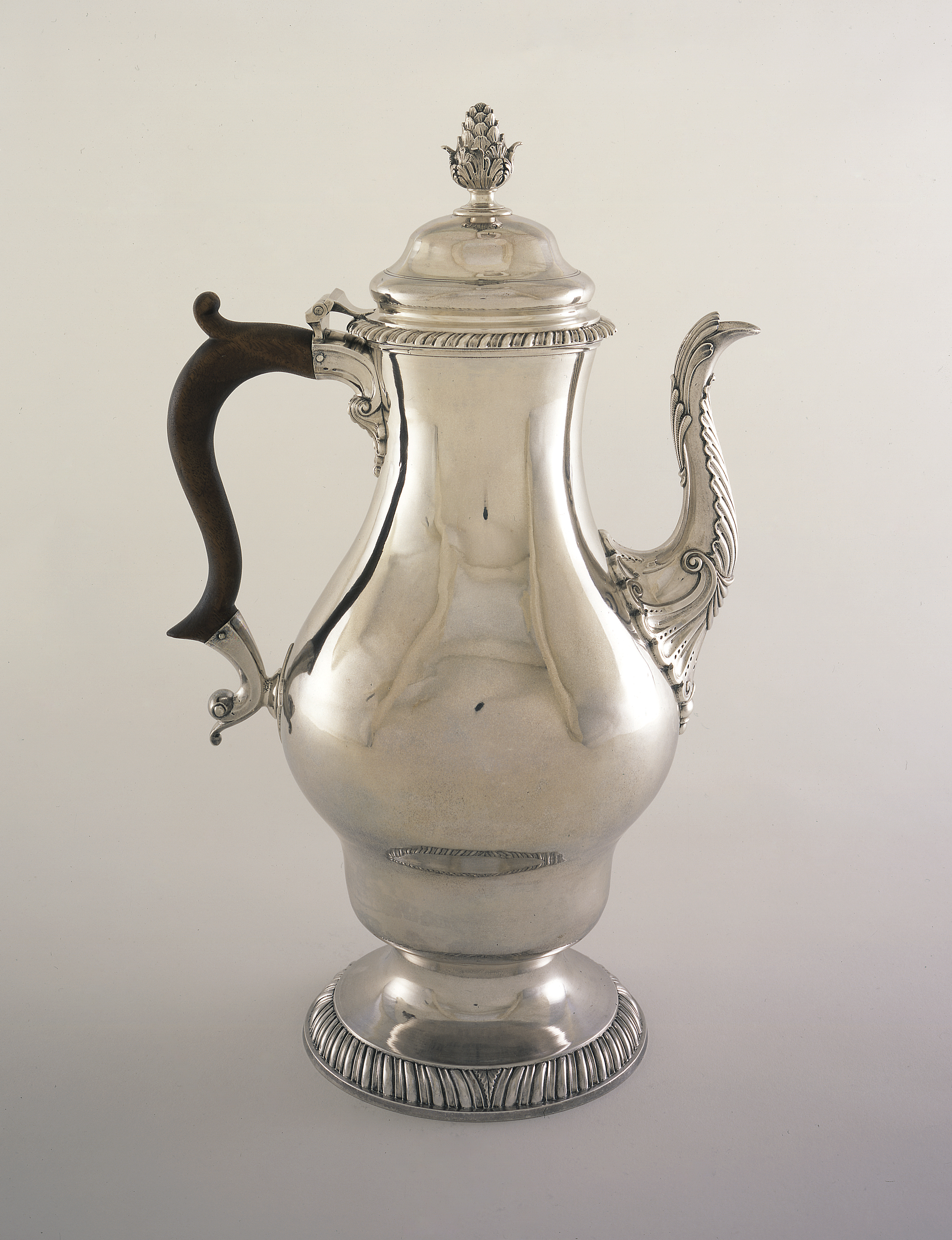 This substantial coffeepot is enlivened by the undulating line of its pear-shaped body, the tight curves of its spout and handle, and the upward lift of the finial atop the lid. The dynamic interplay of curving form and line is one characteristic of silver in the rococo style. Another is the rich vocabulary of shells, acanthus leaves, and scrolls that form the cast handle sockets, finial, and spout. The coffeepot's cast elements were tooled to sharpen the details, add textures, and enrich their surfaces. Finishing of this quality is extraordinary, even for silver made by Myer Myers, a craftsman of Jewish ancestry, who is celebrated as one of the best and most innovative silversmiths of colonial New York.