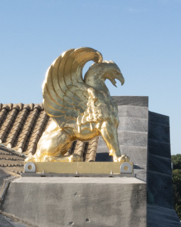 Two identical sculptures sit majestically atop the Saint Louis Art Museum. Alexander Phimister Proctor created the griffins to adorn the building, originally built as the 1904 World’s Fair Palace of Fine Arts. Griffins—mythological creatures with the head and wings of an eagle and the body of a lion—have been used as architectural embellishments since antiquity.