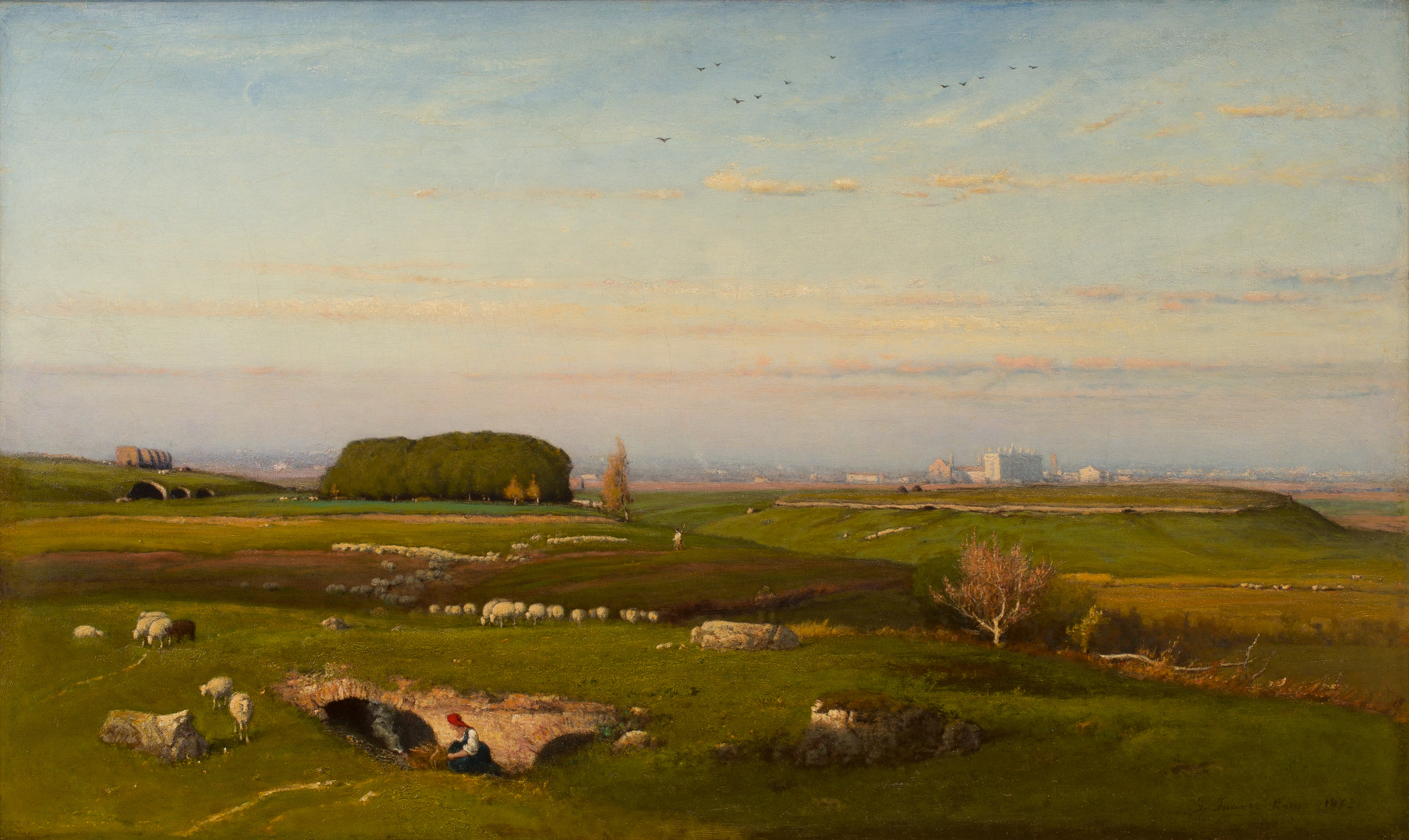 A picturesque flock of sheep graze in an Italian countryside awash in light. The quiet tones of blue and green, and simple forms evoke nature’s quiet poetry. Ruins in the foreground frame the shepherdess and bring to mind Italy’s ancient past. They are contrasted with the background, where the Church of St. John Lateran is visible. This mingling of past and present, of a “golden era” gone by, reflects the way many Americans at the time interpreted the Italian landscape. They viewed such images as a contrast to the promise they believed the United States had as a new country, with no ruins or bygone eras to impede its progress.