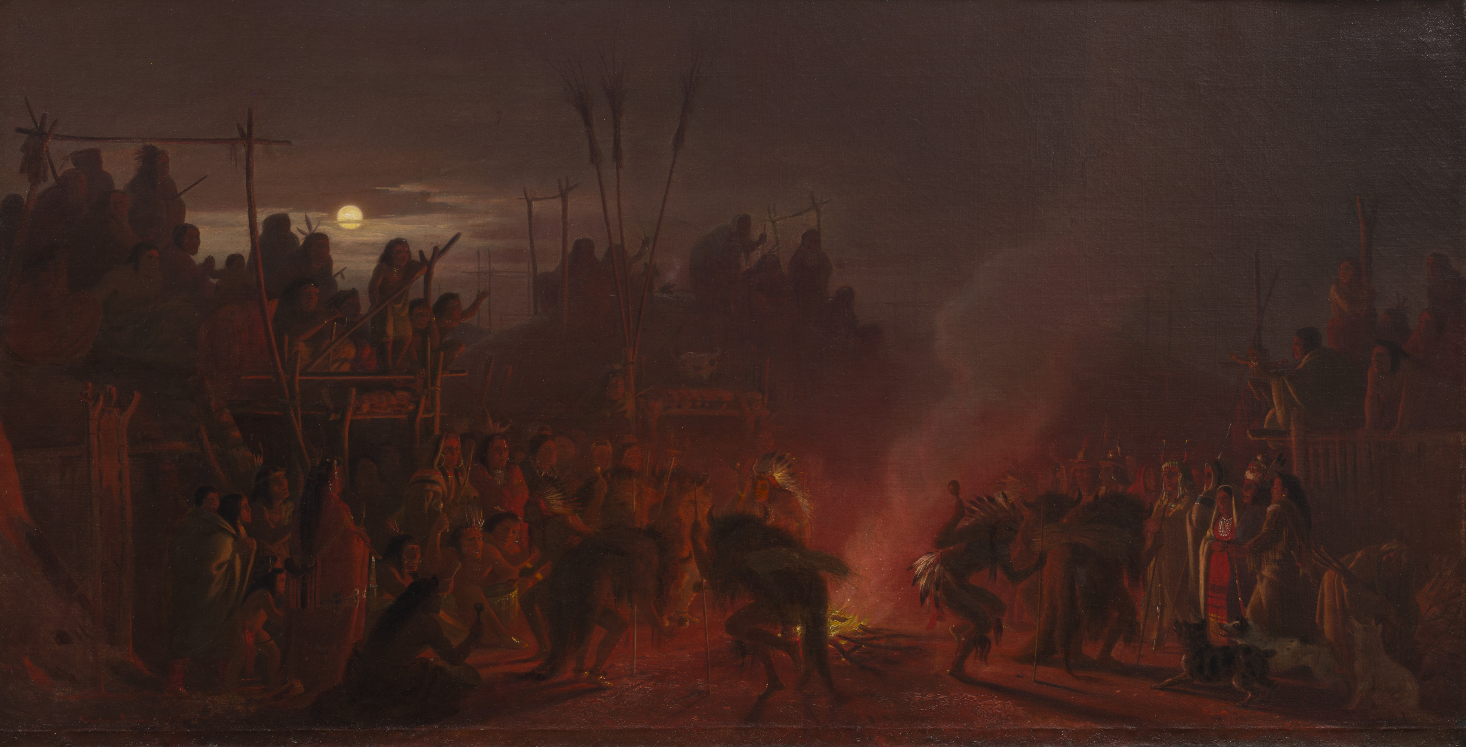 Illuminated by the crimson glow of a fire, Mandan (Namakiki) men perform a complex dance to ensure a successful buffalo hunt. An attentive audience has gathered, and some have climbed the surrounding structures to get a better view of the ceremony. In the late 1850s, Charles Ferdinand Wimar travelled along the Missouri River, taking photographs and making sketches of Native American communities living on the Plains. He used these images, along with artifacts collected during his travels, to compose his paintings.