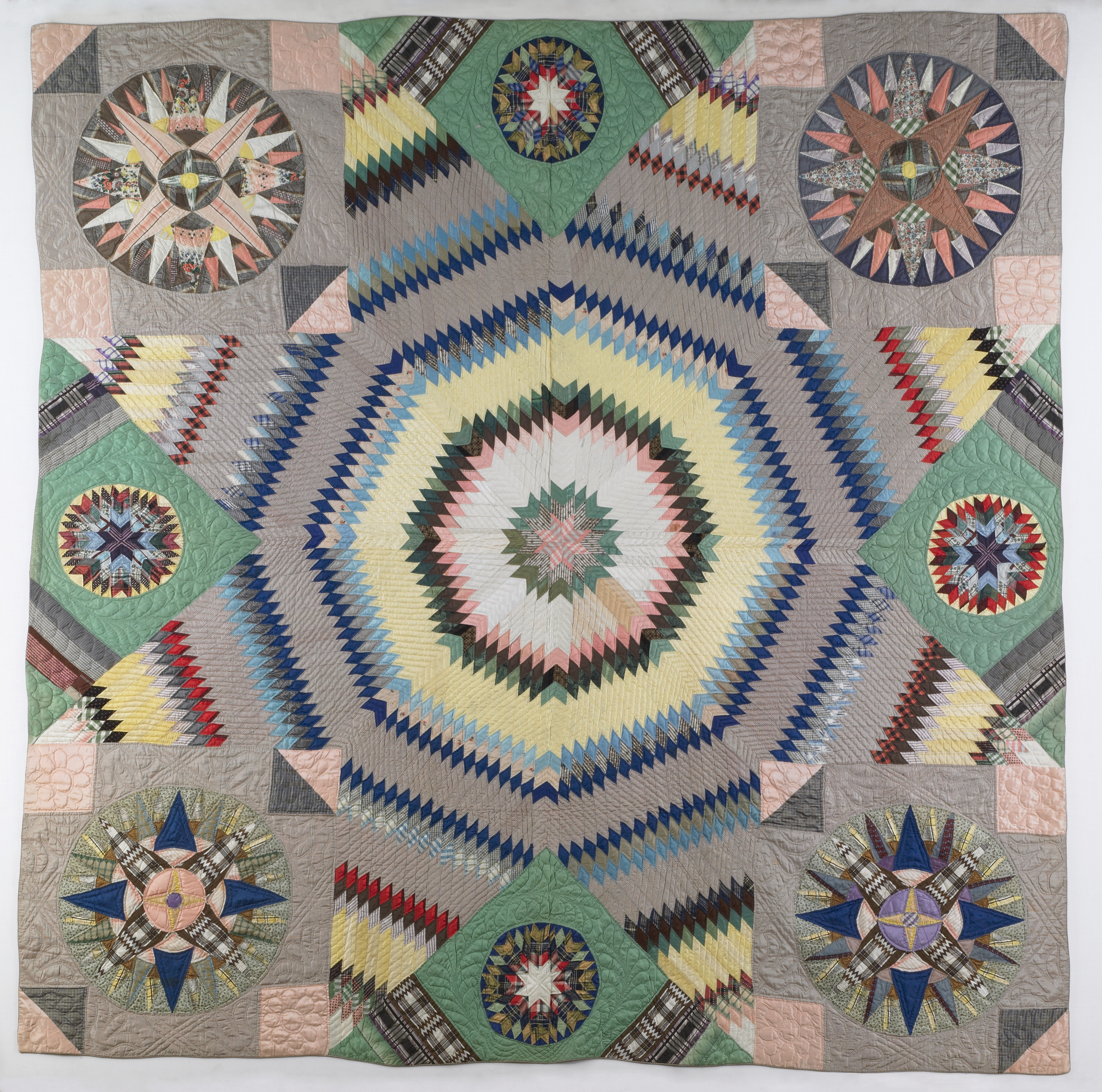 This quilt features two motifs popular in the mid-19th century: the eight-pointed star in the center is the “Star of Bethlehem” pattern, and the “Mariner’s Compass” is seen in each corner. The quilt is in excellent condition because it was a silk “show quilt,” made to display the skills of its maker rather than for everyday use. The Star of Bethlehem requires advanced needlework skills to accurately sew the silk pieces together to complete the pattern. The Mariner’s Compass is also difficult due to its combination of sharp points and curved piecing set within a square.