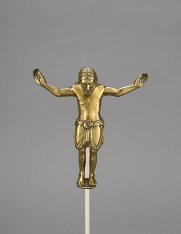 This figure of the crucified Christ (traditionally called a corpus, Latin for body) presents remarkable three-dimensional modeling and emotional sensibility. Details such as Christ’s pectoral muscles, ribs, distinct locks of hair, and the blood flowing from his wound lend a sense of realism to the figure. Christ’s bowed head and closed eyes evoke his suffering. At the same time, the rhythmic folds of his carefully rendered loincloth and the authority of his oversized hands bring an air of gravity and dignity to the diminutive form. This figure of Christ was originally nailed to a metal or wooden cross—note the holes in his hands.