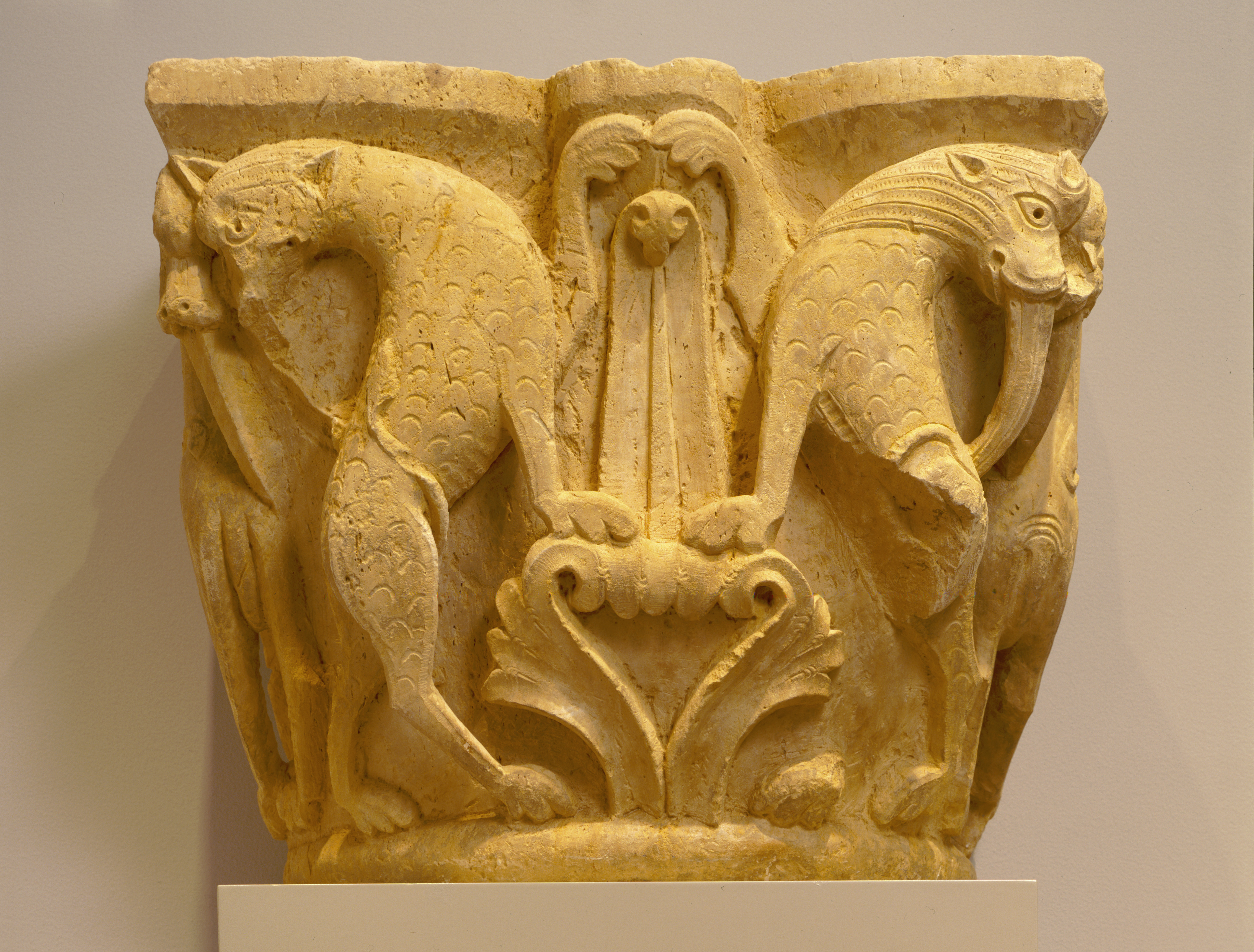 Cat-like animals, perhaps lions, pose with one paw on a leaf while they raise their other in a gesture of aggression. The animals’ bodies face forward while their heads turn backward. This contorted pose aligns the feline heads with the upper corners of the capital, emphasizing its greater width at the top and a narrowing at the sides. This is typical of medieval decoration that enhances the shape of the object that is embellished.