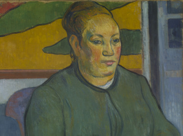Paul Gauguin produced this portrait during a tempestuous two months spent in the company of Vincent van Gogh at Arles in the south of France. This female model was the local postman’s wife, and Gauguin focused on her ruddy complexion and reddish-brown hair. He also painted areas of flat, abstracted color, such as the shadow and the wall behind the chair. The woman’s form is strongly outlined in Prussian blue while a schematic version of one of the artist’s own pictures, Blue Trees, is visible on the wall behind.