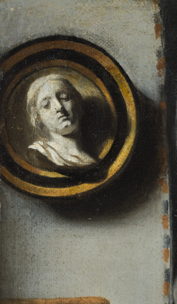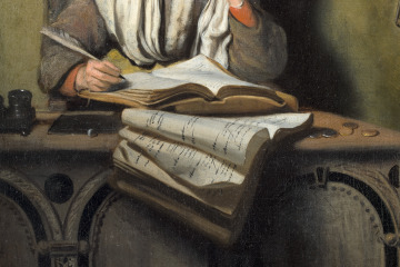 A woman dozes off as she updates her account books. Carefully defined horizontals (the desktop and wainscoting) contrast with verticals (the cabinet door, the pillars adorning the desk front), to create a carefully structured composition. The paired inkwells on the table echo the spheres on the map, and the bowls on the shelf are seen in both profile and full-interior views, all suggesting deliberate planning rather than casual observation. Such conscious order is in risk of collapse since the ledgers seem on the verge of toppling to the floor. The painting was undoubtedly intended to invite reflection, although we don’t know whether this woman represents a widow struggling to make ends meet, an elderly woman evaluating her life, or the sin of sloth.