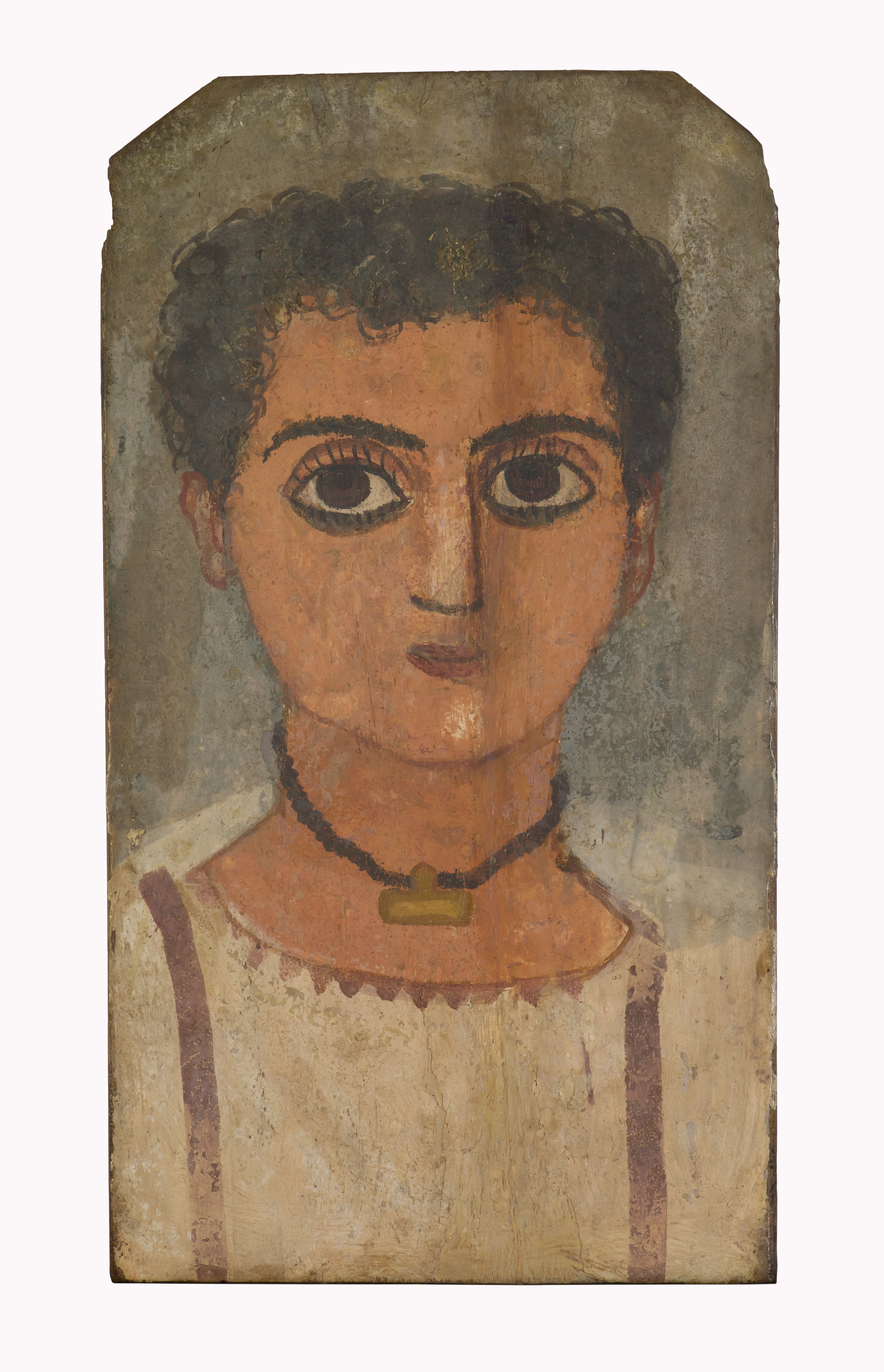 The gender of this child may not be obvious at first glance, but the white tunic and amulet around his neck were commonly worn by elite male children. The necklace, called a "lamella," was a container for a small, rectangular sheet of gold incised with a magical spell to protect the wearer.