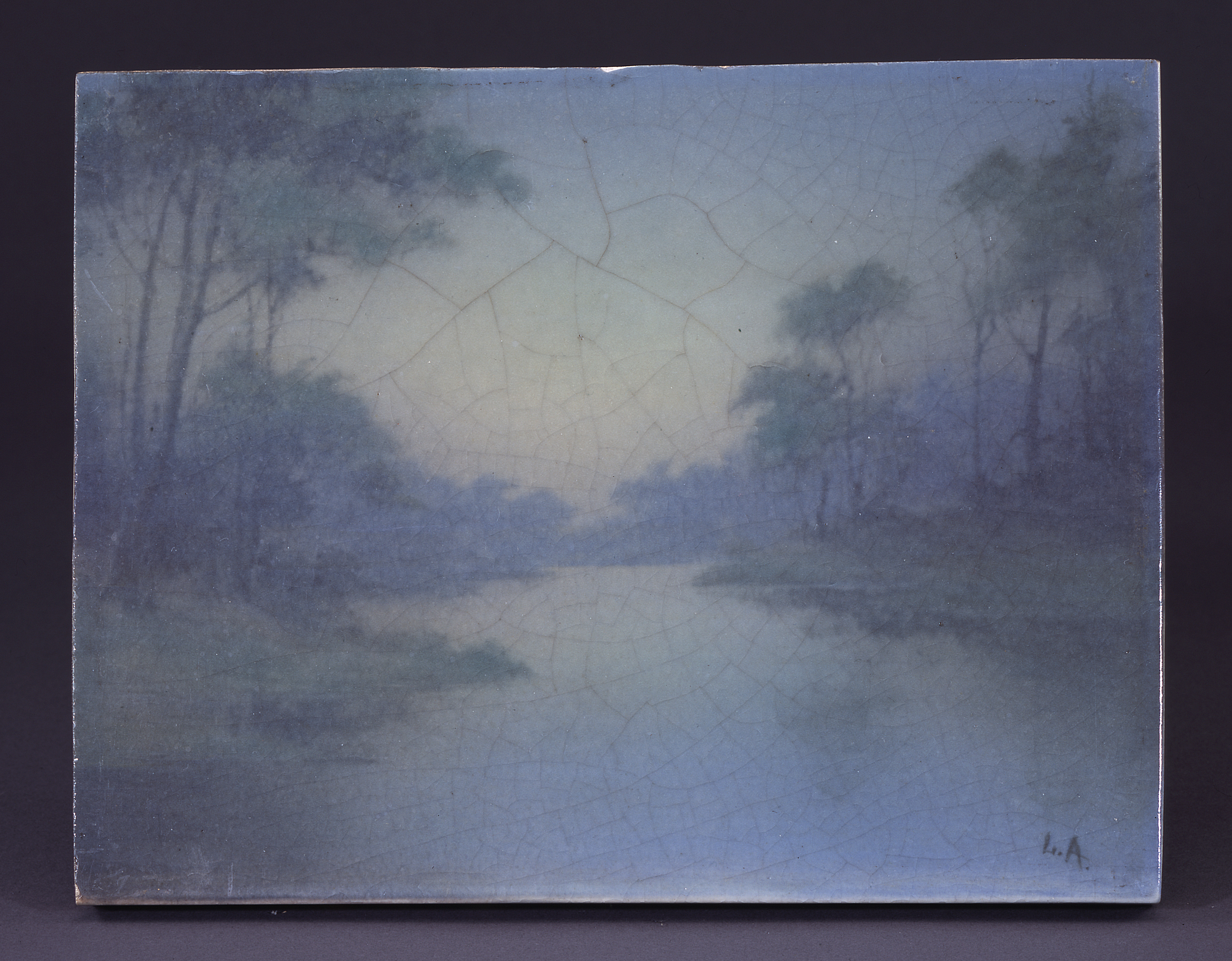 Lenore Asbury's hazy foliage and soft shades of blue and green in this plaque evoke the mood of tonalist painting, which was characterized by a subdued palette and misty scenery. The plaque's rectangular format and strong sense of receding space, along with the placement of the artist's signature at lower left, suggest further connections to traditional landscape painting.