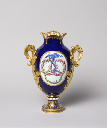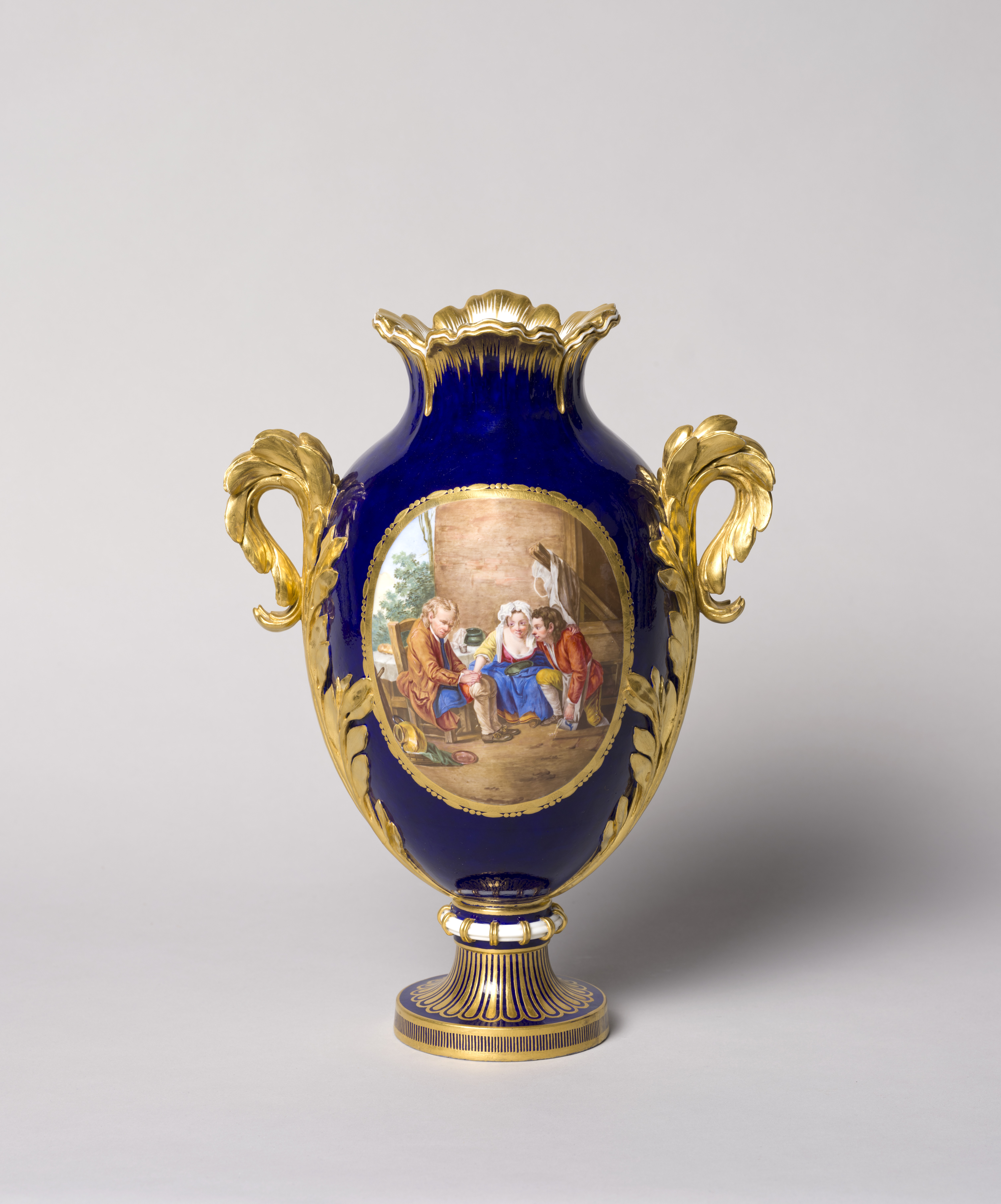 The sumptuous blue surface, gilded leaf-handles, and delicate painting of these ornamental vases exemplify the Sevres factory's mastery of porcelain making in the mid 18th-century. Rimmed in gold, the top opening resembles precious shells while the handles seem to have been formed by encasing myrtle leaves in gold. The vases bear narrative scenes based on compositions by the French painter Jean-Baptist Greuze (1725-1805). Mommy (La Maman), shows a mother trying to feed her younger son while the older one grabs at the spoon intended for his brother.