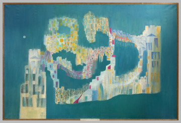 In a walled city, two towers are connected by a labyrinth of houses floating against a brilliant teal sky. Alice Rahon painted this scene in thin layers, incorporating sand and incising outlines for texture. The presence of both the moon, at upper left, and sun, embedded within the cityscape, suggests the passage of time. Gradual color variations allude to the four seasons of the title. Originally a Surrealist poet, Rahon concentrated on painting when she settled in Mexico in 1939 to avoid the Nazi occupation of France. In such works she drew on historic art and legends and landscapes she had witnessed—synthesizing these into imaginative apparitions that transcend reality.