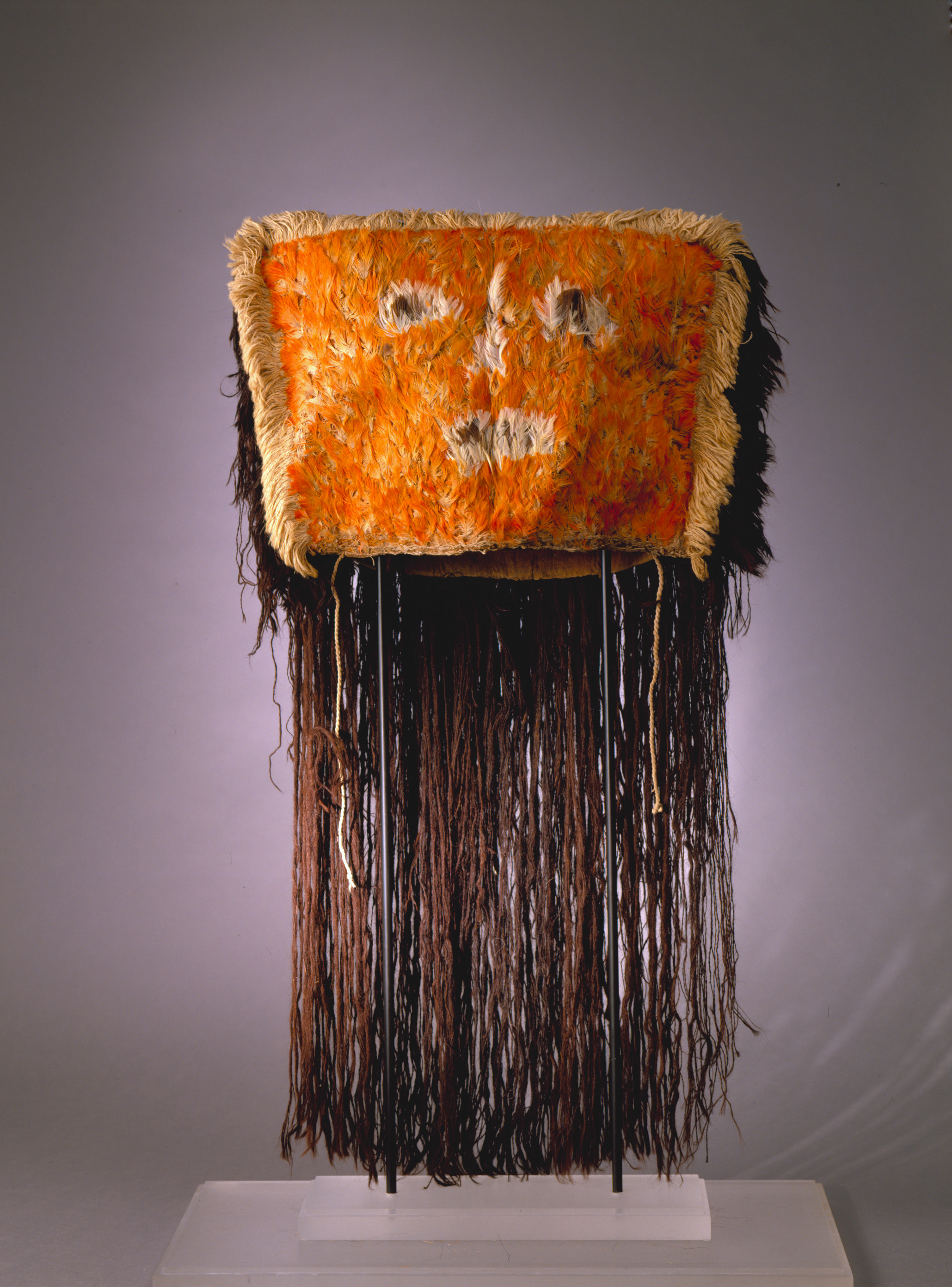 In ancient Peruvian religious thought, the dead inhabited the realm of the living, their spirits and preserved bodies nourishing future generations. Deceased ancestors were preserved in order to take part in ongoing ritual life. The Wari, for example, formed mummy bundles with the bodies of elites. Individuals were placed in a seated position, wrapped in numerous layers of cloth, and dressed in elaborate textiles. Mummy bundles were then topped with false heads, such as the mask seen here. The feather mask’s open eyes, brightly colored face, and realistic hair communicate the living essence of the deceased person it covered.