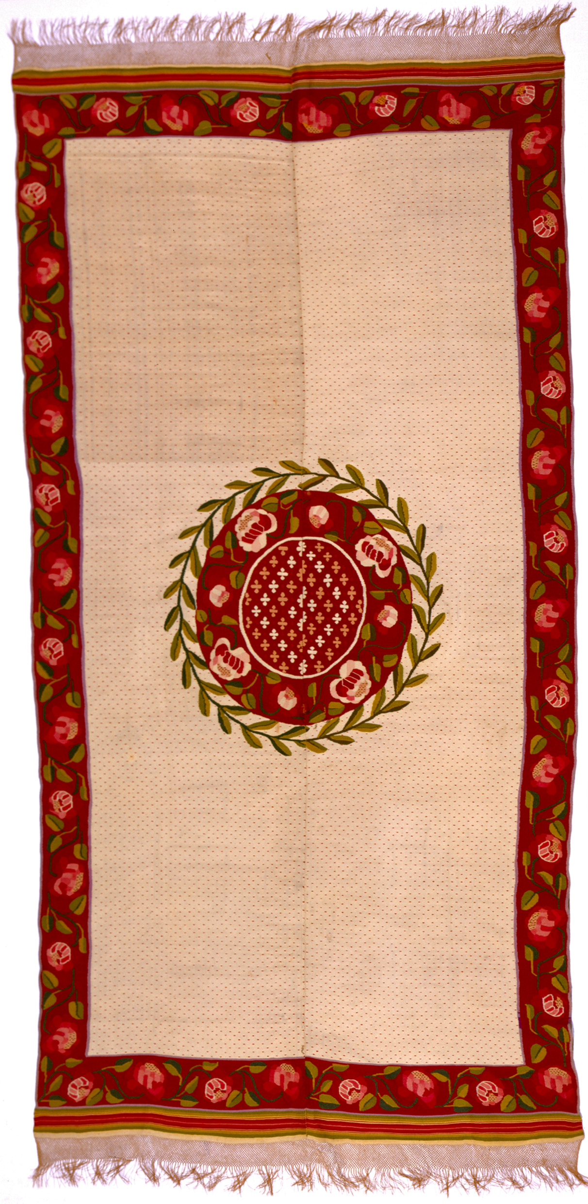 This serape has a central floral pattern which frames the face when the garment is wrapped around the shoulders. At the time this serape was woven, the introduction of synthetic dyes and floral and pictorial images from Europe was radically changing the serape style. Serapes such as this one are often referred to as “saltillo” after the northern Mexican town of Saltillo, where weavers would sell serapes at the annual trade fair.
