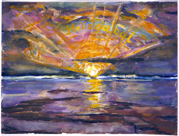 In this vibrant watercolor of a sunset, Anselm Kiefer makes reference to the Roman Emperor Heliogabal, who was born in Syria. He paints the emperor's name between the sun's rays, transforming the seemingly benign sunset to include a larger historic and cultural reference. As emperor from 218-222, Heliogabal imposed, among other things, the worship of the sun god Baal as the state religion. The emperor's reign was short lived: the imperial family ordered his death by drowning at the age of 18. The sunset not only symbolizes Heliogabal's murder and the dousing of his revolution, but it also alludes to the fleeting authority of emperors and other leaders.