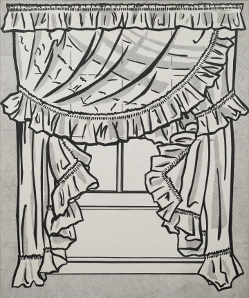 The frilly kitchen curtains depicted here suggest the suburban developments of post-World War II America. In his black-and-white paintings of the early 1960s, Roy Lichtenstein drew from popular, mass-produced imagery; the source for Curtains was a newspaper advertisement. The everyday domestic subject matter of this painting melds interior decoration with high art. While the image implies a critique of consumerism, it also presents a visual pun on the traditional notion of painting as a window onto the world.