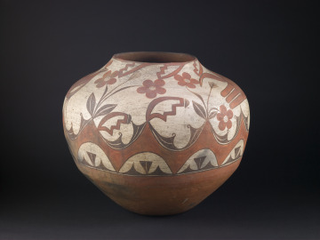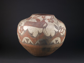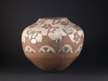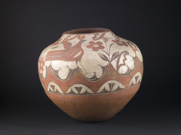 Artists from Zia Pueblo in northern New Mexico have long earned praise for compositions of paired birds and flora. The placement of these motifs above the central band distinguishes this work. At the point where this stylized imagery meets the abstract design, the painting evokes an undulating landscape of arroyos, or gullies that channel flash floods.