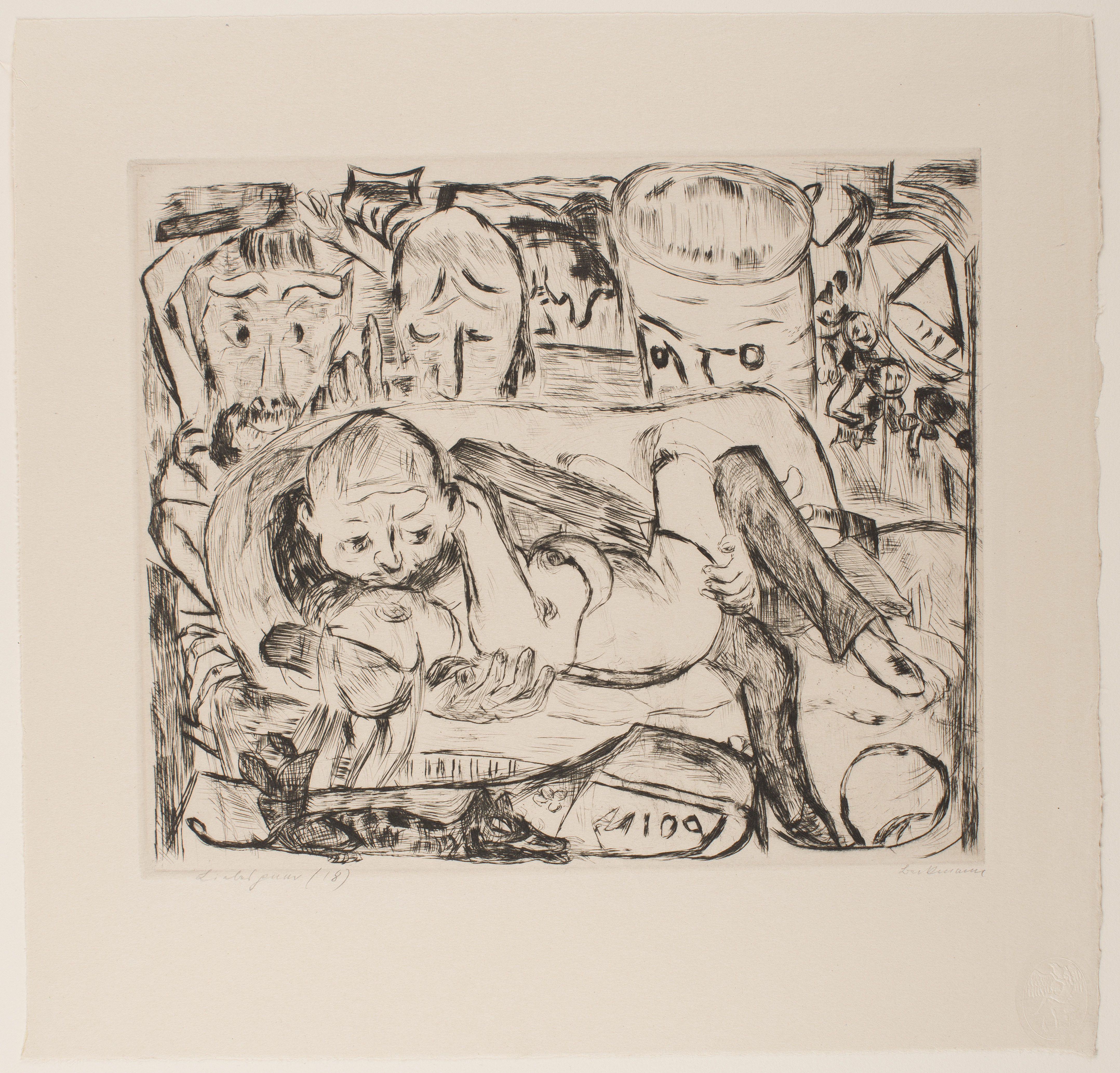[1] In a letter dated November 16, 2001 to Francesca Consagra at the Saint Louis Art Museum, Allan Frumkin indicates that while he acquired the core of his Beckmann collection from the dealer and gallery owner I.B. Neumann during the late fifties, he also purchased some prints after the late fifties at auction [SLAM document files]. Included on the Frumkin Collection list dated November 17, 2001, together with the above-mentioned letter, are six drypoints from the "Faces" portfolio, which Frumkin annotates as having been purchased from I.B. Neumann. Prints 145:2002.1- 145:2002.18 are not included on the list. Frumkin mentions, however, that he did not have a master list of the prints and that there were probably omissions, since he was forced to work from memory. It is not, however, clear whether he acquired this impression from I.B. Neumann, at auction, or from another source altogether.
