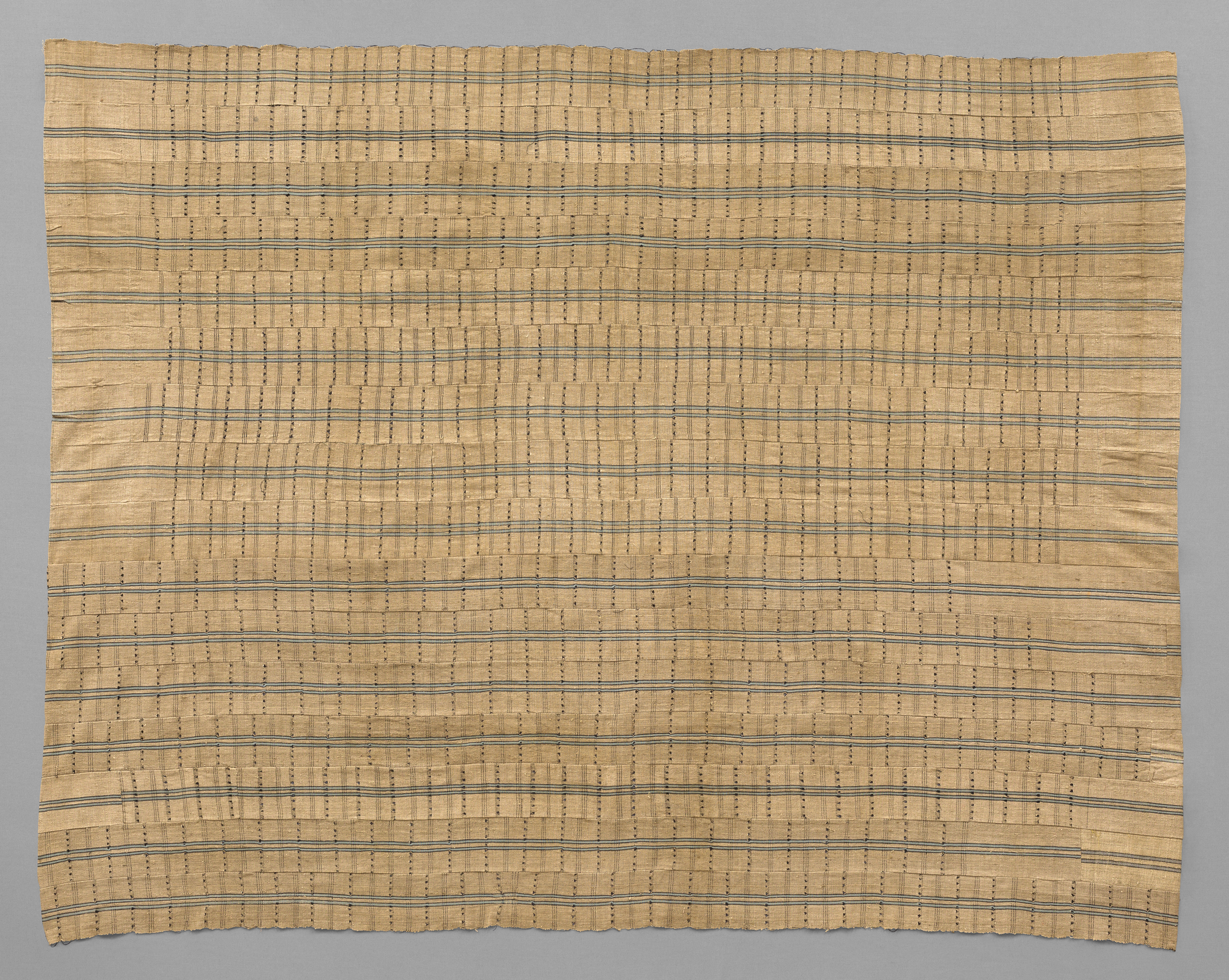 Traditional Yoruba weavings were made of indigenous cotton spun and dyed by women. The yarns were woven into strips of cloth by men and then stitched together by women to form a completed piece. Once the privilege of the ruling class, today strip-woven cloth is worn by all adult Yoruba for ritual and ceremonial occasions.
