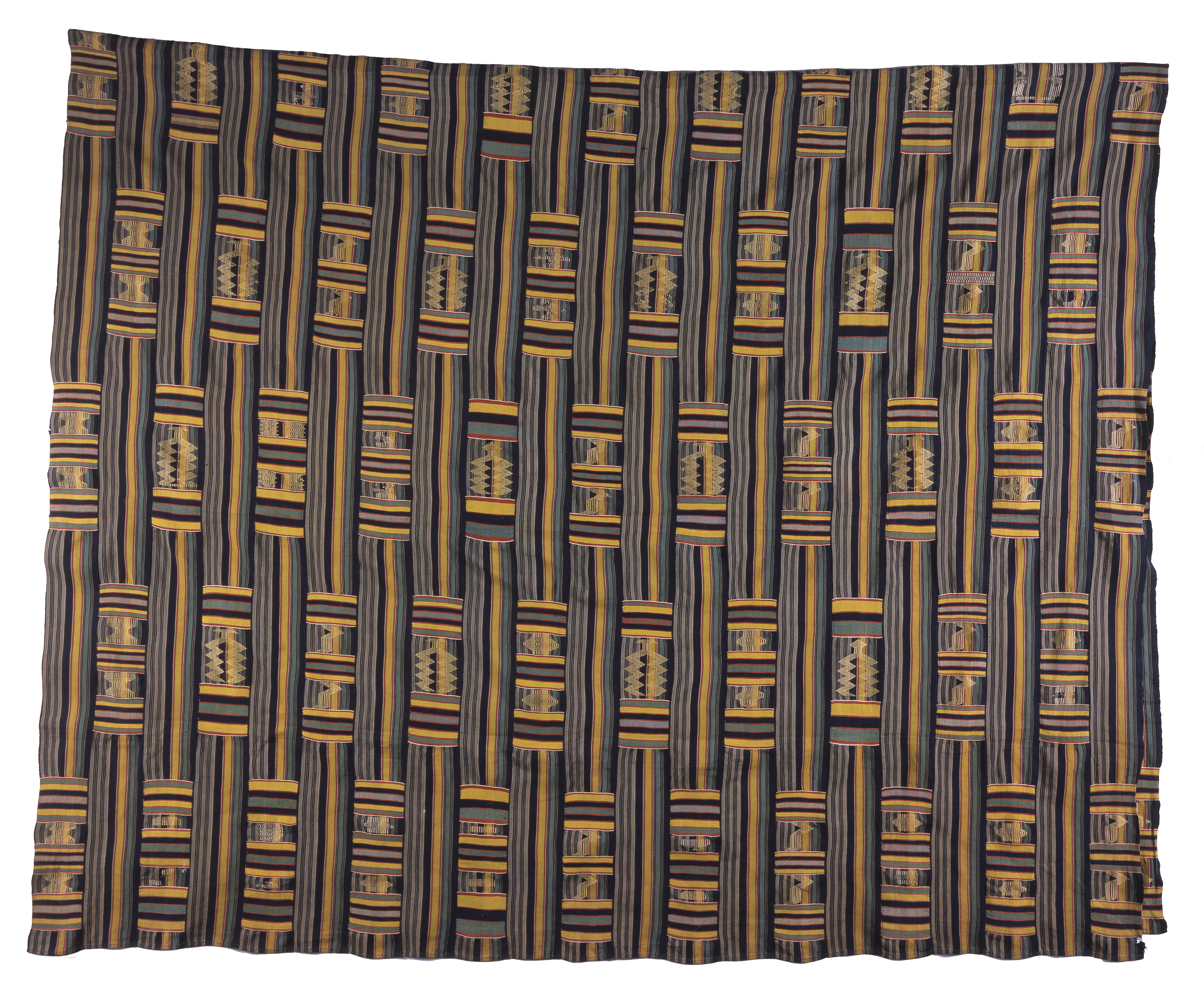 For centuries the Ewe people, along with their neighbors the Asante, were masters of the strip weaving technique. Whereas kente is the name used by the Asante for their fine strip-woven cloth, the Ewe people called theirs keta. Woven by Ewe men, these cloths are made on narrow, portable looms. The ground fabric consists of lengthwise running stripes that are interrupted by blocks of decorative patterning achieved through a weft inlay technique. The more complex the weave, the more expensive the cloth.