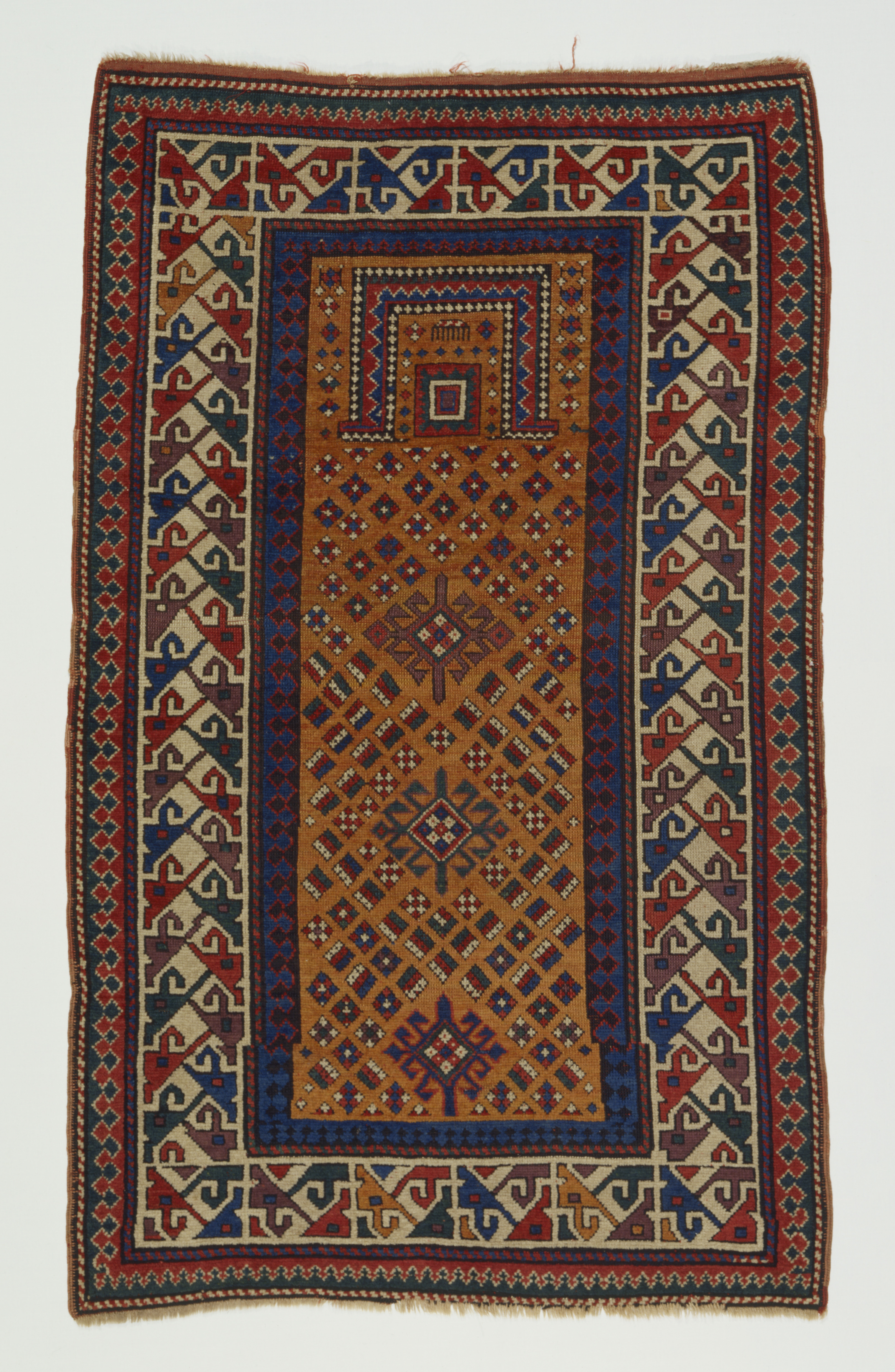 Strong color and bold patterns characterize carpets from the Caucasus, whose rug- producing peoples include Christian Armenian groups as well as Muslim, Turkic, and Kurdish tribes. The hooked lozenge in the border and center medallions of this rug is a device often found in rugs from the Kazak region, but the floating elements surrounding the medallions are an unusual feature. The U-shaped element at the top of the rug is a mihrab, or arch, which identifies it as a prayer rug.