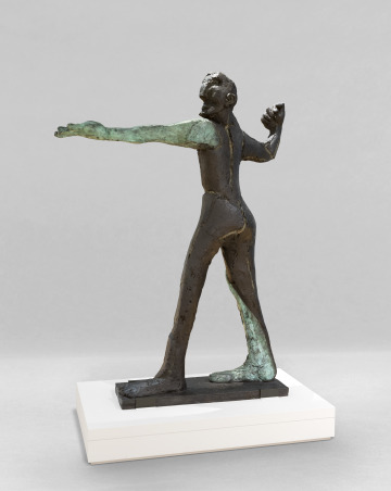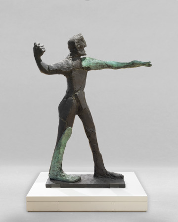 A monumental bronze figure stands with feet firmly planted and one arm raised—as if to throw a spear or lightning bolt—while the other extends straight ahead. Markus Lüpertz represents a Titan, a god from Greek mythology who, together with his siblings, fought and lost a 10-year battle against Zeus and the Olympian gods. The sculpture has roughly formed features and a craggy texture, which express the brute strength of the Titans. Lüpertz painted a leg and arm of the sculpture in bright green, which resembles an ancient patina, or surface finish, and further heightens the drama of the scene.