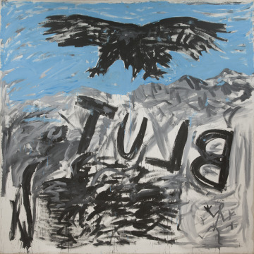 A black eagle hovers above the German word "blut," or blood, spelled backward. A.R. Penck was fascinated with the eagle, a longstanding symbol of German national identity. When paired with the word blut, it recalls the trauma of Germany’s past, particularly the terror and bloodshed of World War II and the Holocaust. Penck, who lived in East Germany at the time he created this painting, was suggesting a shared German history and the responsibility of Germany as a whole to examine its past.