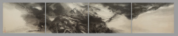 This painting depicts an expansive landscape splashed in ink across four paper panels. Land, water, and natural features are represented from a high perspective. Reading from right to left, the first panel depicts an open expanse of water; the second panel, an extended isthmus or peninsula. The third features dense hills and mountains ranging beyond the tops and branches of evergreens; the fourth panel shows an opening expanse of water.