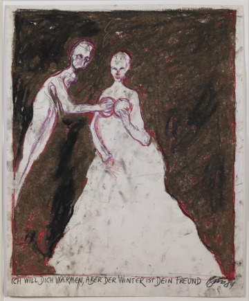 Described by the artist as a self-portrait, this drawing features a thin man, suspended in mid-air, touching the breast of a woman wearing a long white gown. According to the artist, "this drawing enters the psychological realm. I could have made the man larger, but decided to draw him small. The woman has rebuffed him, and this rejection has diminished him." The words inscribed in graphite along the bottom of the drawing translated as "I want to warm you, but winter is your friend," are a reference to the woman's cold indifference. Surprisingly, the woman featured in the drawing is not a depiction of someone Günther Brus knew, but is a reference to the women in long white gowns shown in 19th century portraits by James McNeill Whistler, Edvard Munch, and Gustav Klimt.