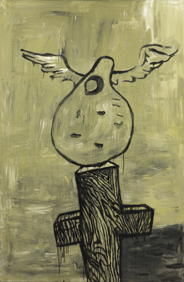 Set against a muted abstract background, a curious form with outstretched wings rests atop a wooden cross. For this work, Walter Dahn, a member of the Cologne-based Mülheimer Freiheit artist group, referenced a 1974 painting by German artist Anselm Kiefer. Kiefer’s painting featured an artist’s palette with wings hovering over a tomb with a cross, alluding to the death and resurrection of artistic creativity. With irreverent humor, Dahn transformed Kiefer’s palette into an amorphous shape, making a caricature out of this symbol of the artist’s craft.