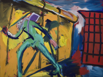 In this vibrant, expressive nighttime scene, an elongated figure strides toward the Berlin Wall. A guarded concrete barrier, the wall separated East and West Berlin from 1961 to 1989 both physically and ideologically. According to the painting’s title, the figure is none other than 19th-century Dutch painter Vincent van Gogh, an artist Rainer Fetting admired. Fetting co-founded an artist-run gallery in the Kreuzberg neighborhood of West Berlin, a protective space for alternative lifestyles. His work captured the atmosphere of West Berlin, where student protests and the LGBTQIA+ rights movement demanded societal change despite the constraints of the wall.