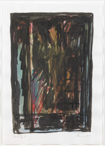 In this drawing Günther Förg portrays window reflections with bold black lines and areas of bright colors. Simultaneously, the viewer sees an exterior fire escape at right, the window pane, and elements of the room's interior. The imagery is a mediation on the spatial relationships of light and color. The work also mirrors the mood of the artist on the day he painted it, New Year's Eve, 1985. Förg painted this work after mourning his father's death, saying that he chose lighter colors beneath the black to convey hope.