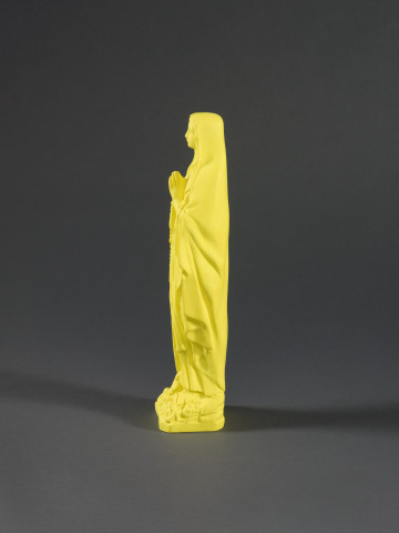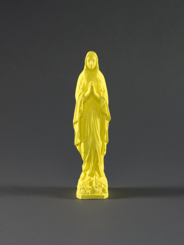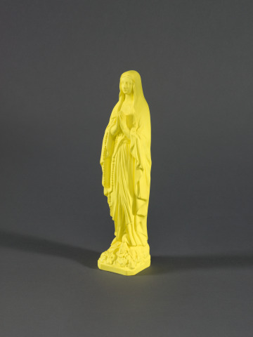 “Madonna Figure” is cast from a small plaster statuette found in a tourist shop in Lourdes, France. Pilgrims, or people traveling to sacred sites for religious reasons, come to Lourdes in hopes of witnessing a miracle.