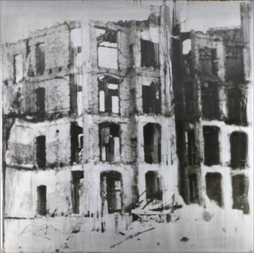 Ulrich Görlich is known for originating innovative experimental photo processes. Here, he reproduced a source photograph of a destroyed building on Hohenzollerndamm, a main street in the West Berlin neighborhood of Wilmersdorf. Görlich transferred the image to aluminum, giving the luminous ruins an eerie ghostlike quality—perhaps referring to the ability of photographs to preserve people and places that have vanished. However, dark drips of the medium make the photograph appear to dissolve like the decomposing building it depicts.