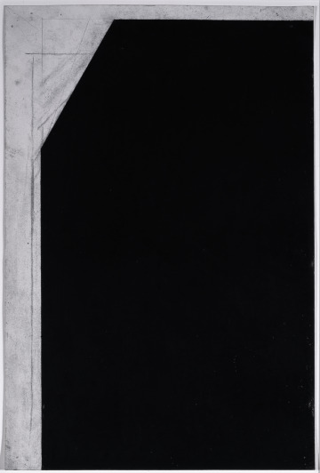 Hubert Kiecol's striking black and white drawing of a geometric, simplified shape represents the side of an ordinary house. This work is part of an untitled series of drawings that feature both common buildings and isolated structural elements. For Kiecol, his use of the color black is appropriate for the building the form represents. The drawing makes reference to sculptures the artist was making at the time. Kiecol produces works that structural features from any spatial context to leave the viewer feeling slightly disoriented and bewildered.