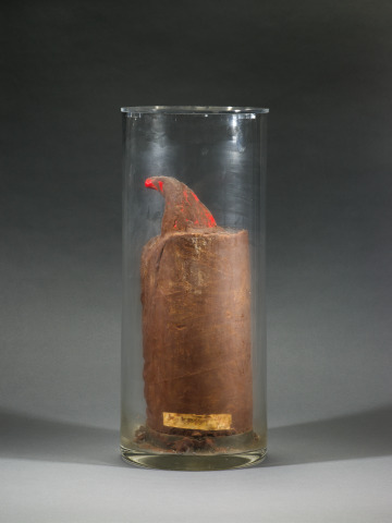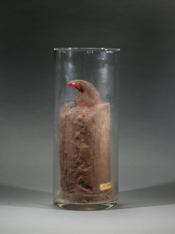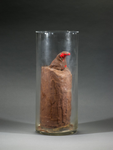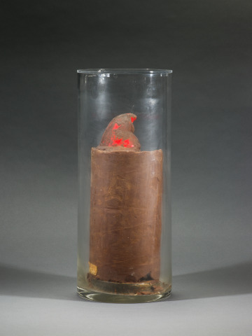 In this wry sculpture, a garden gnome drowns in chocolate leaving only the tip of its hat visible. Dieter Roth made art from everyday materials to address issues of culture and commerce within post-World War II society. In the 1960s, he began to use perishable food, demonstrating art’s inherent instability and transience. Roth worked extensively with chocolate between 1968 and 1970. Often associated with pleasure and as a major consumer good of Switzerland, where Roth was raised, here it assumes a more sinister character.